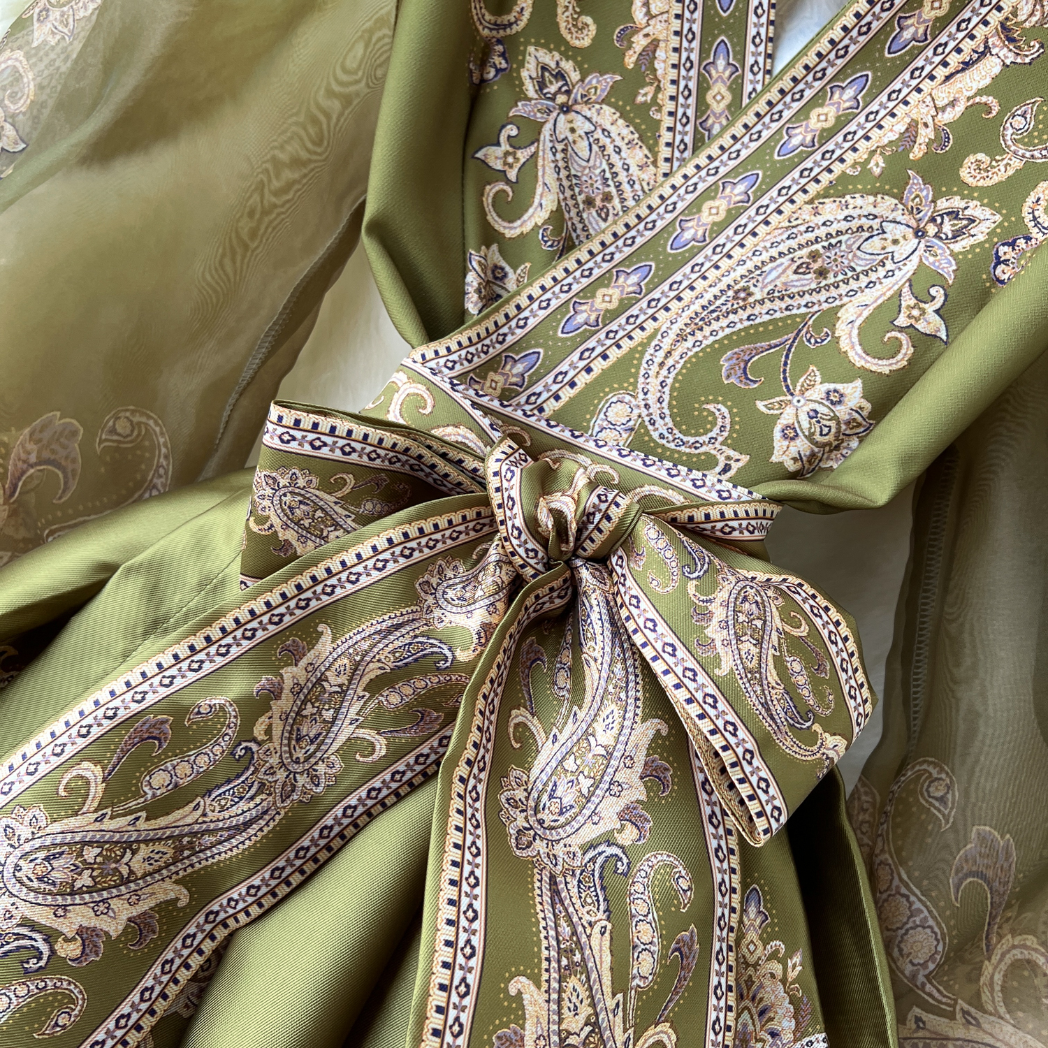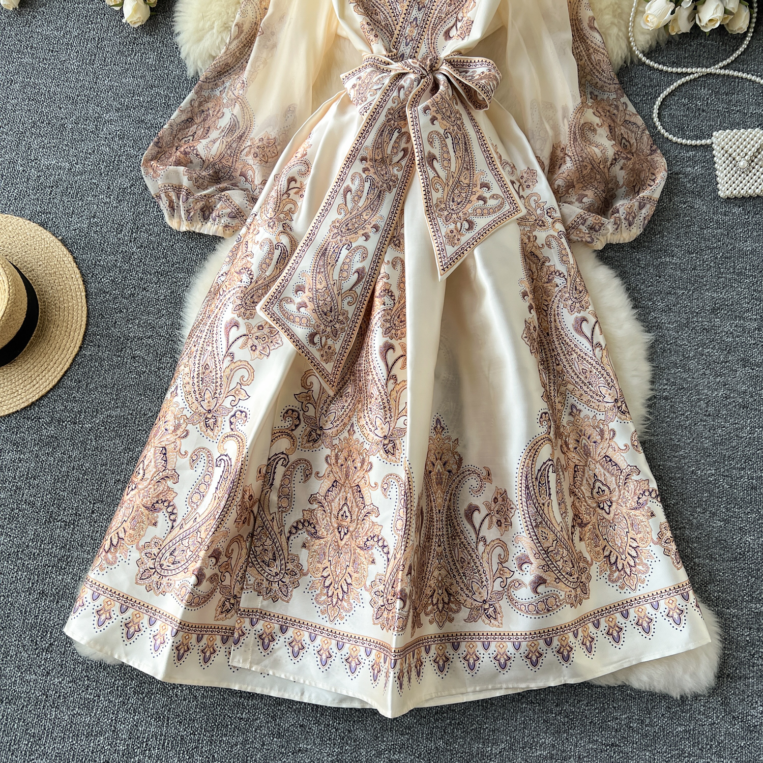 2025年春新作 スクエアネック ヴィンテージ ワンショルダー タイダイ柄 パレス風 フリル付き ミディアム丈 パフスリーブワンピース