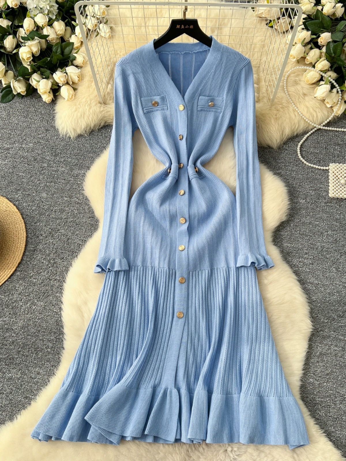 法式高级感小香风名媛V领金属排扣收腰修身长袖荷叶边针织连衣裙