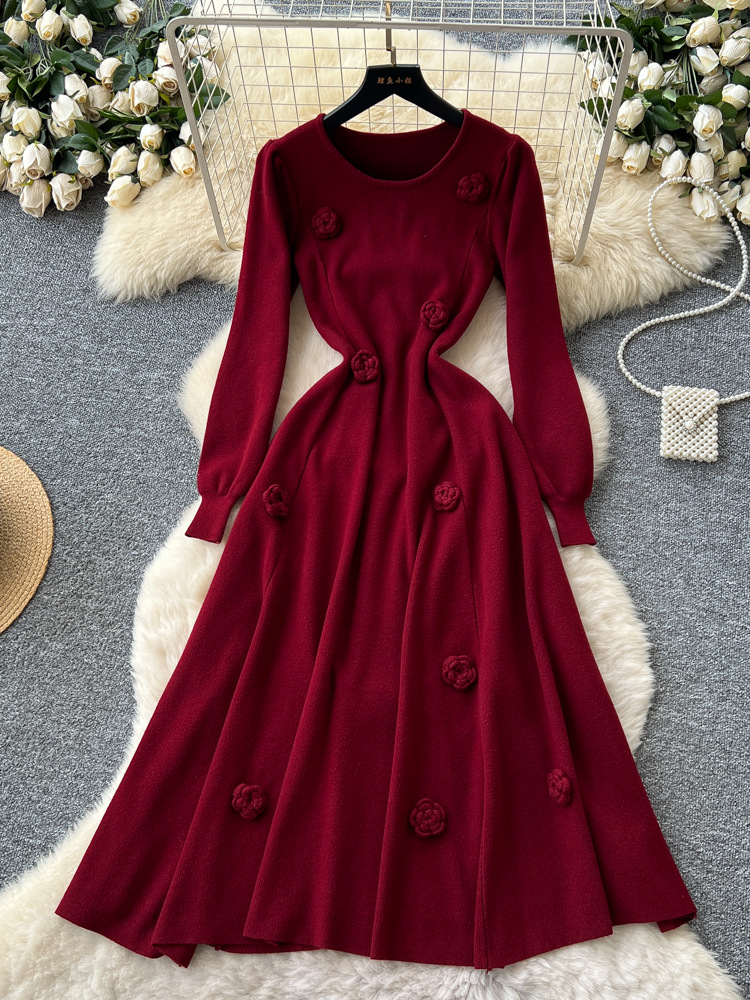 法式高级感立体花朵圆领长袖收腰针织连衣裙女秋季内搭毛衣裙长裙
