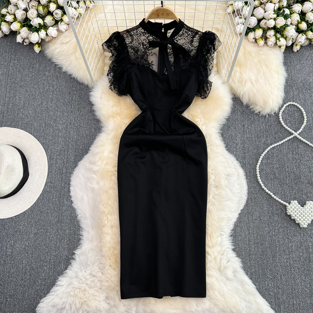 フランス式宮廷風水溶レース半袖ワンピース透かし彫りフック花蝶襟ストラップ気質優雅スカート