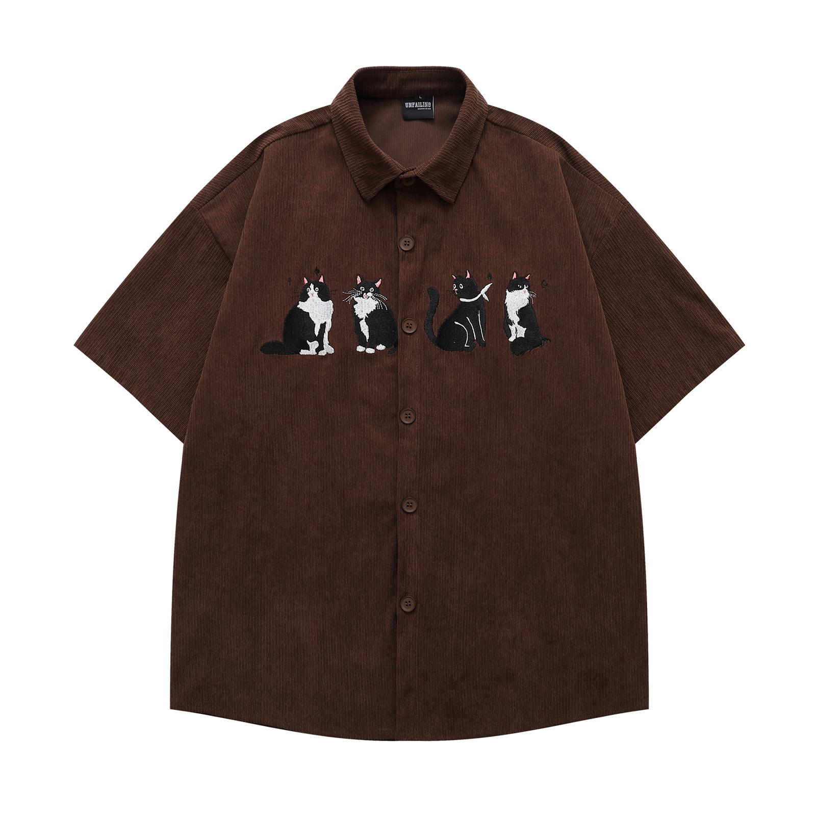 アメリカのレトロ趣味猫刺繍コーデュロイ半袖シャツ