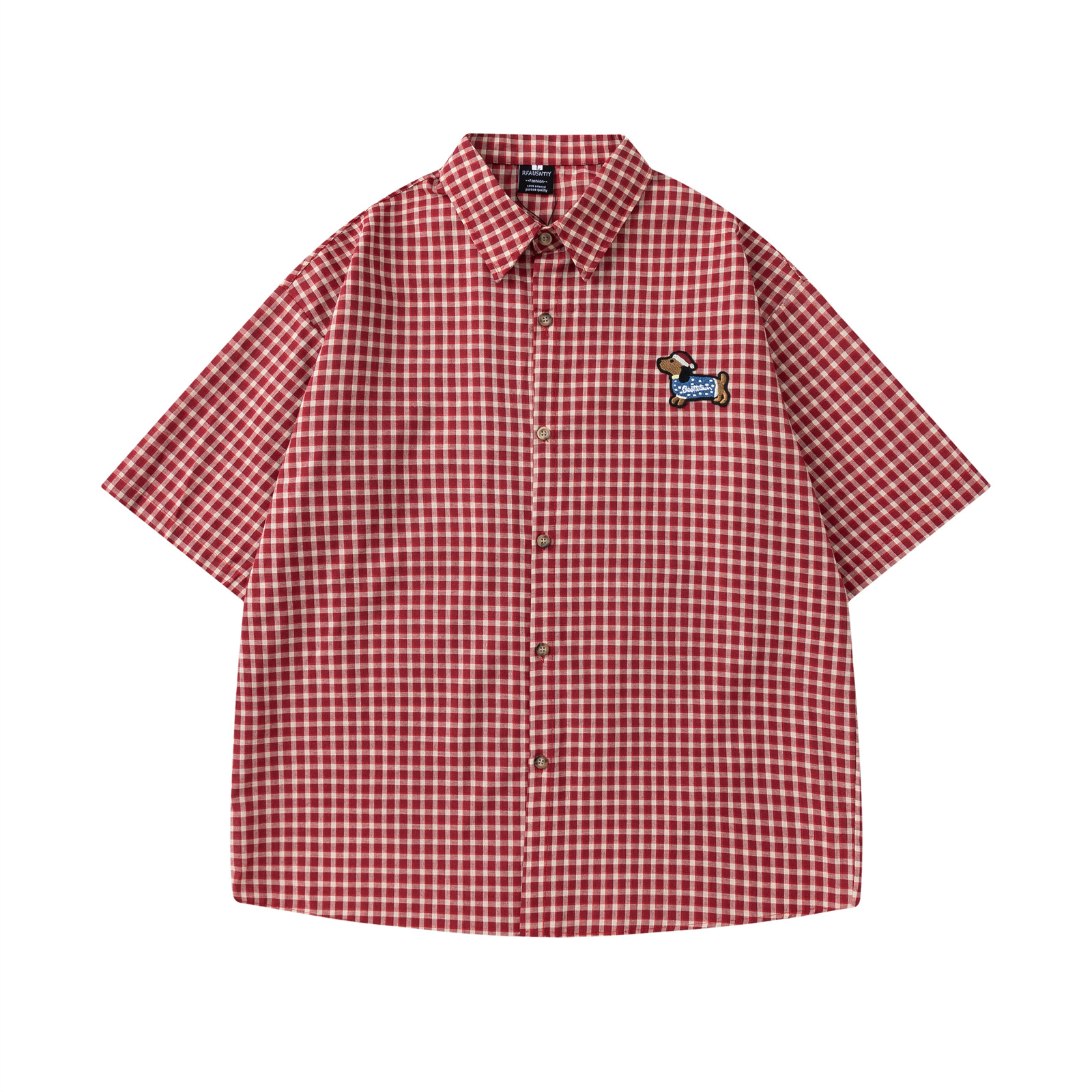 アメリカのレトロ趣味ソーセージ犬刺繍格子半袖シャツ
