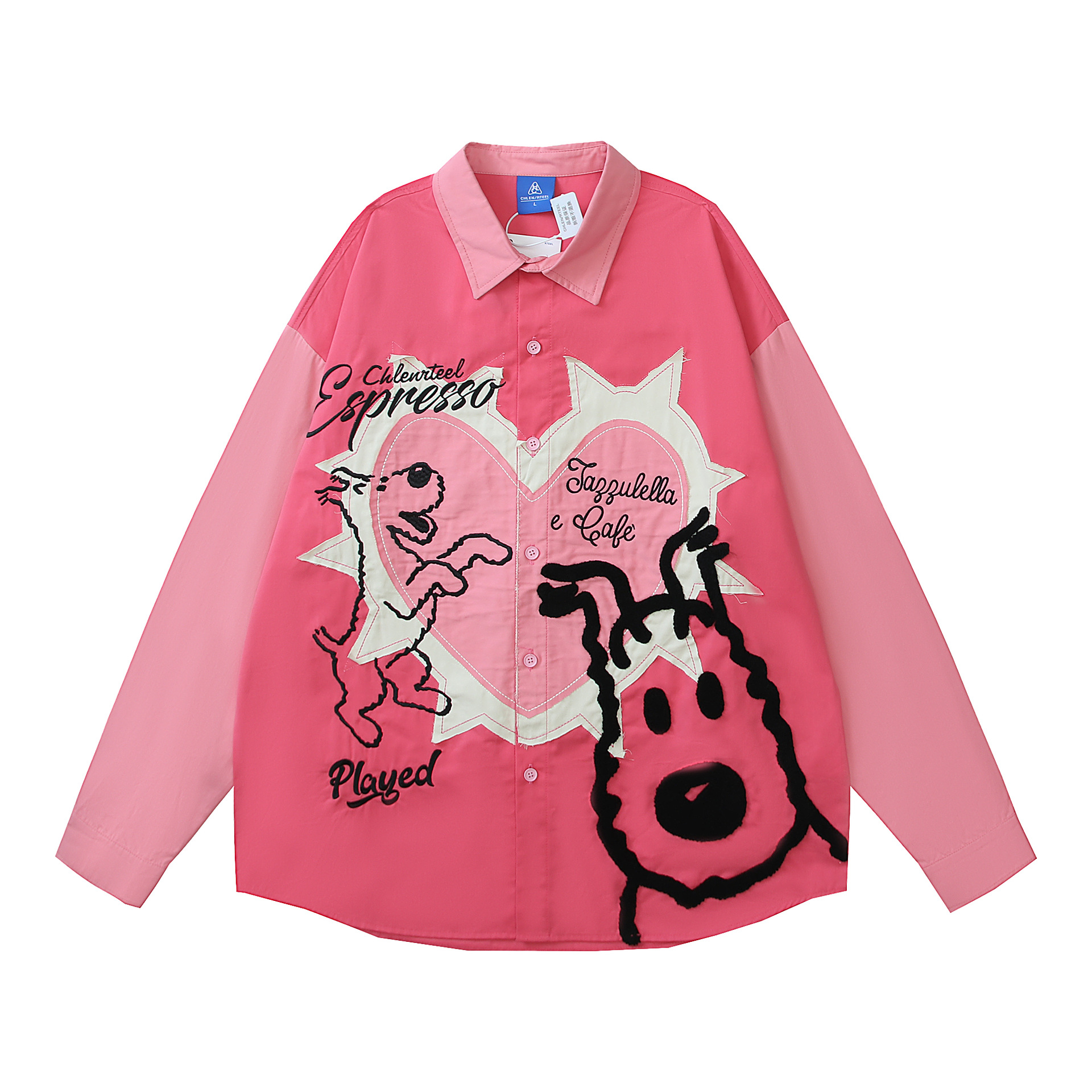 アメリカのレトロな子犬の布の刺繍は長袖のシャツの男女のゆったりしている秋のbfのシャツのコートをつなぎます。