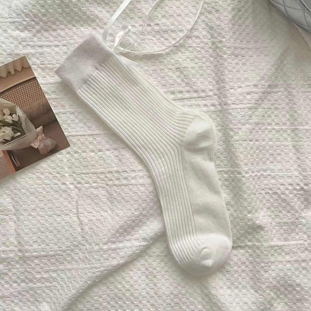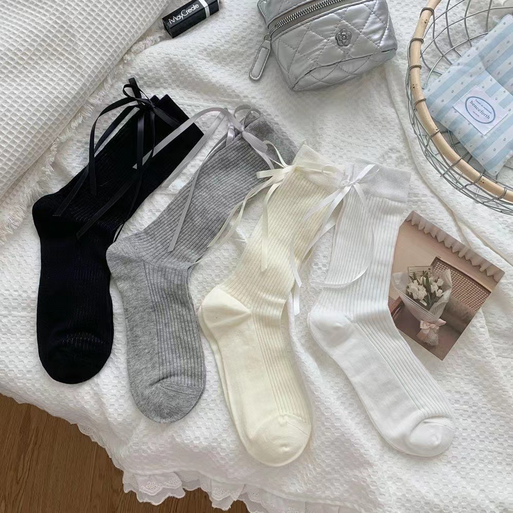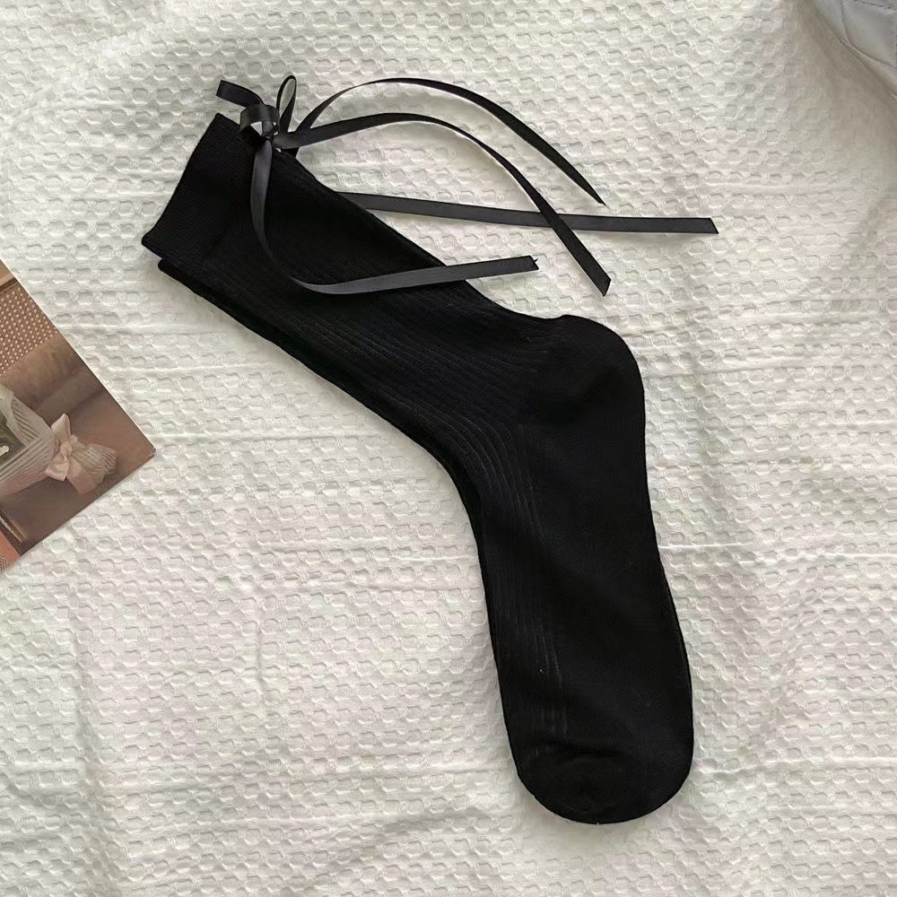 2026年春の女性用ソックス、インスタ映えするリボン付き黒白JKロリータ風万能バレエソックス、ふくらはぎ丈ソックス