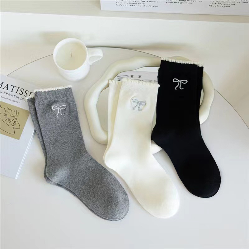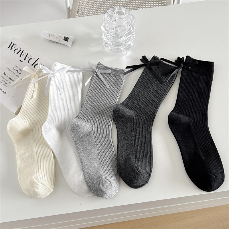 厳選されたmiu蝶結びソックス、女性用春夏ミドル丈ソックス、バレエ風ダンスソックス、ロリータ風黒白グレーソックス、女性用
