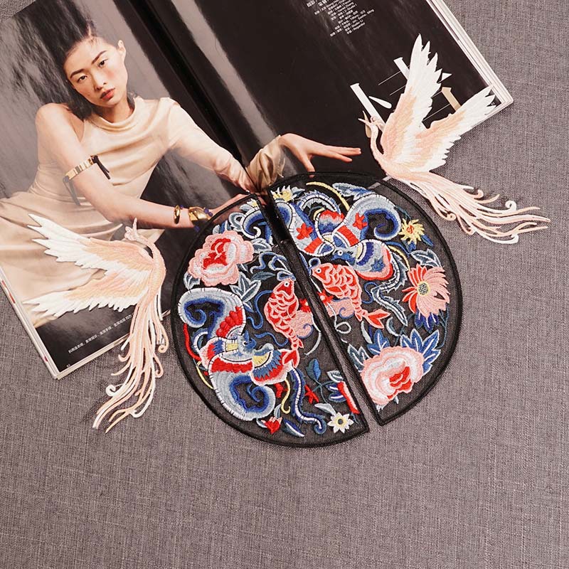 チャイナドレスの服はネットの糸の底の民族風の刺繍を貼って魚の鳳凰の蝶の補子の中国風の刺繍の布を貼って円形を貼ります。