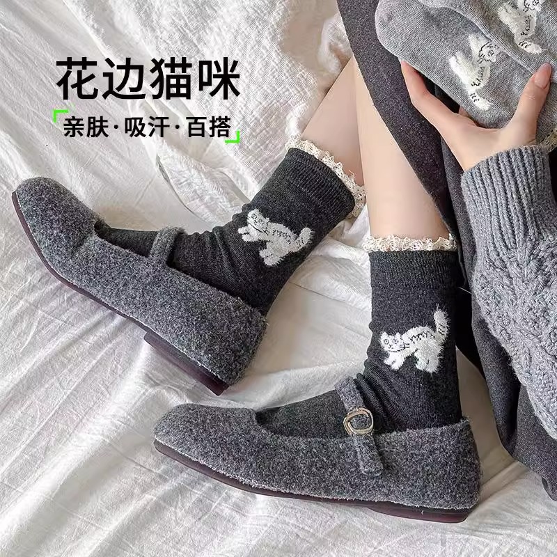 新しいレースの靴下の女性の春の夏のかわいいぬいぐるみの猫の中筒の靴下と楽福の靴の灰色の積み重ねの靴下