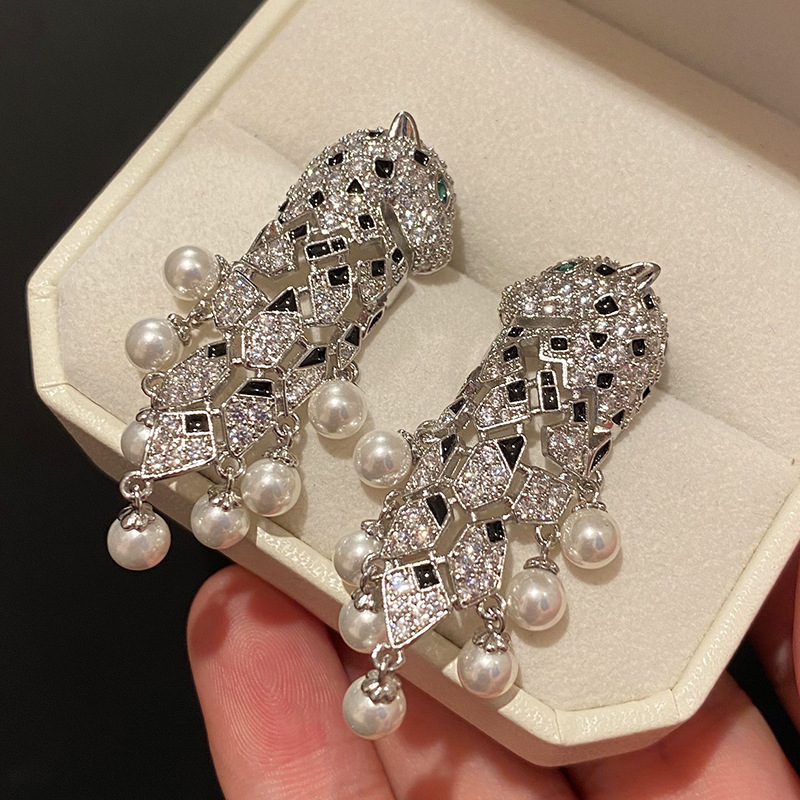 中古流行黒斑豹真珠流蘇イヤリング誇張ins銀針ピアス女バロックイヤリング