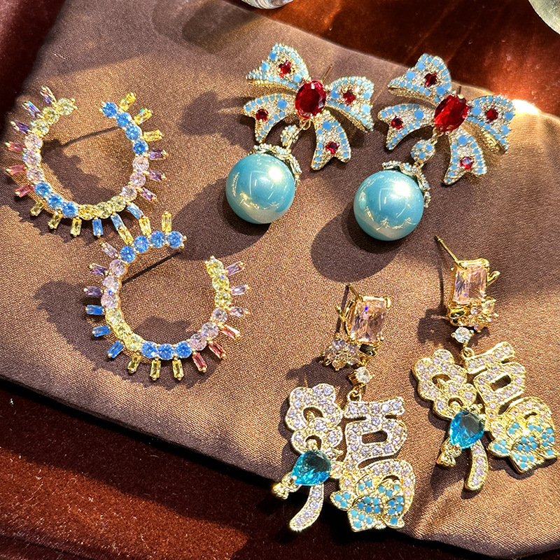 重工のバロックの赤いドリルの蝶結びの真珠のイヤリングのc形は色のダイヤモンドの福の字の小さい衆の耳飾りの精巧な復古の色彩を挿し込みます。