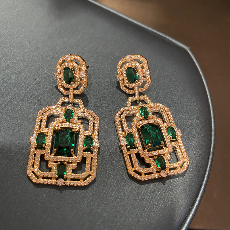 金色の四角い模様は緑の宝石水晶の長いイヤリングをはめ込んでいます。