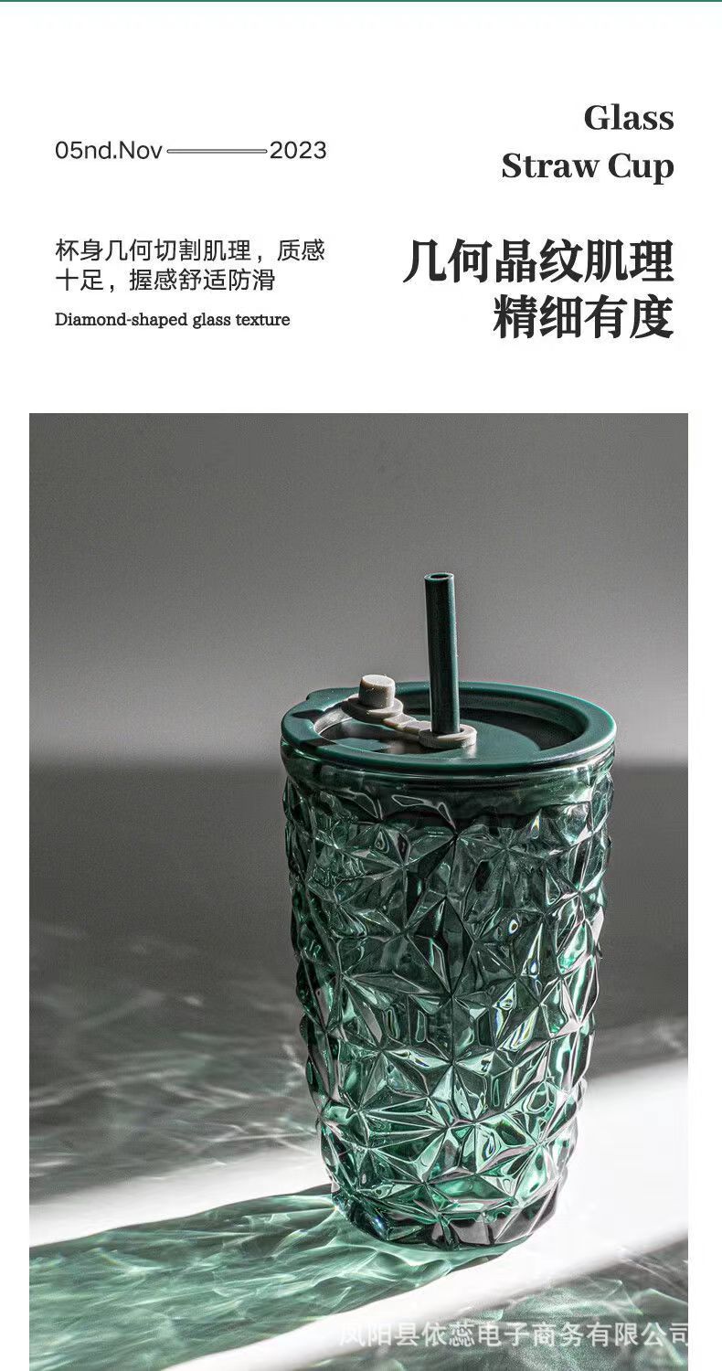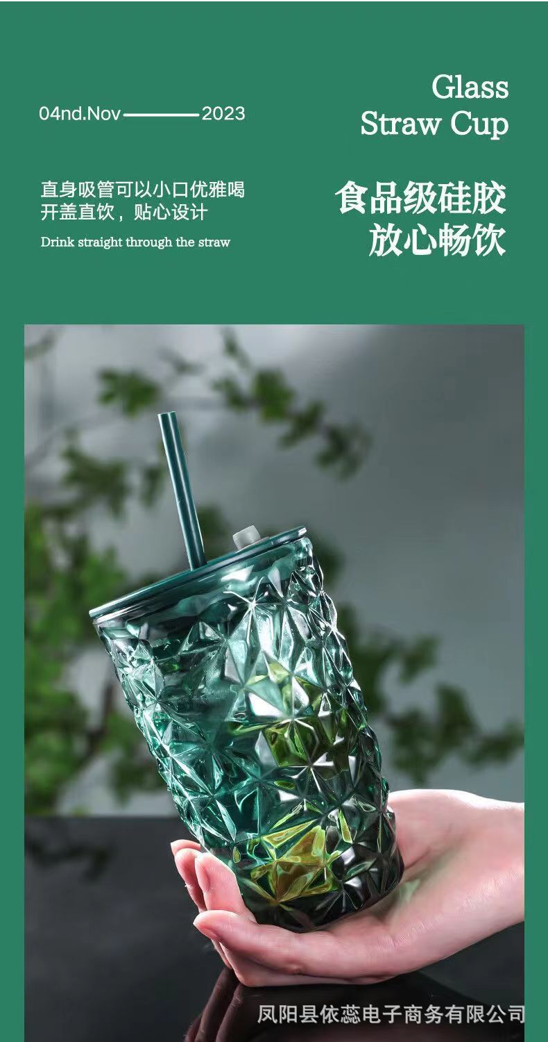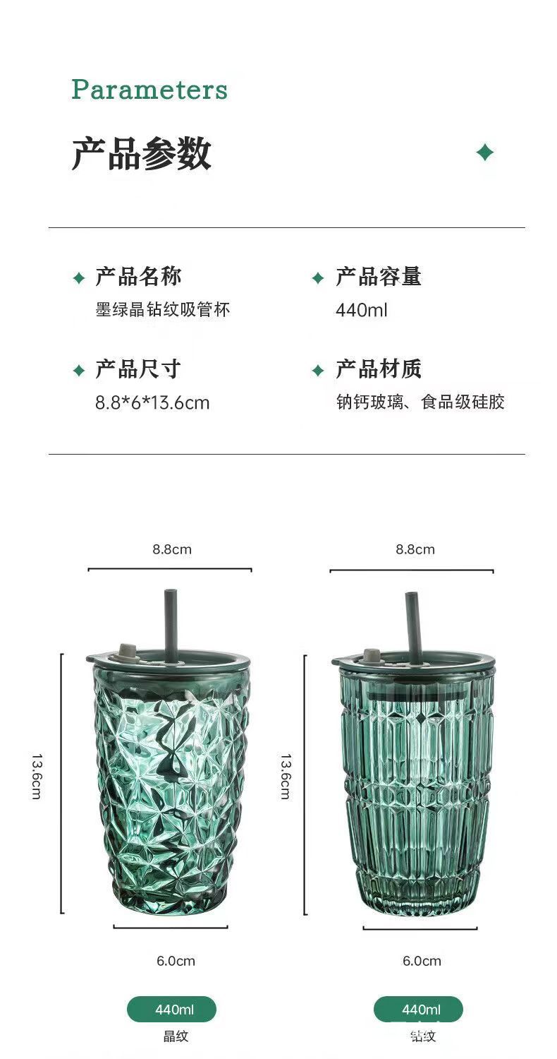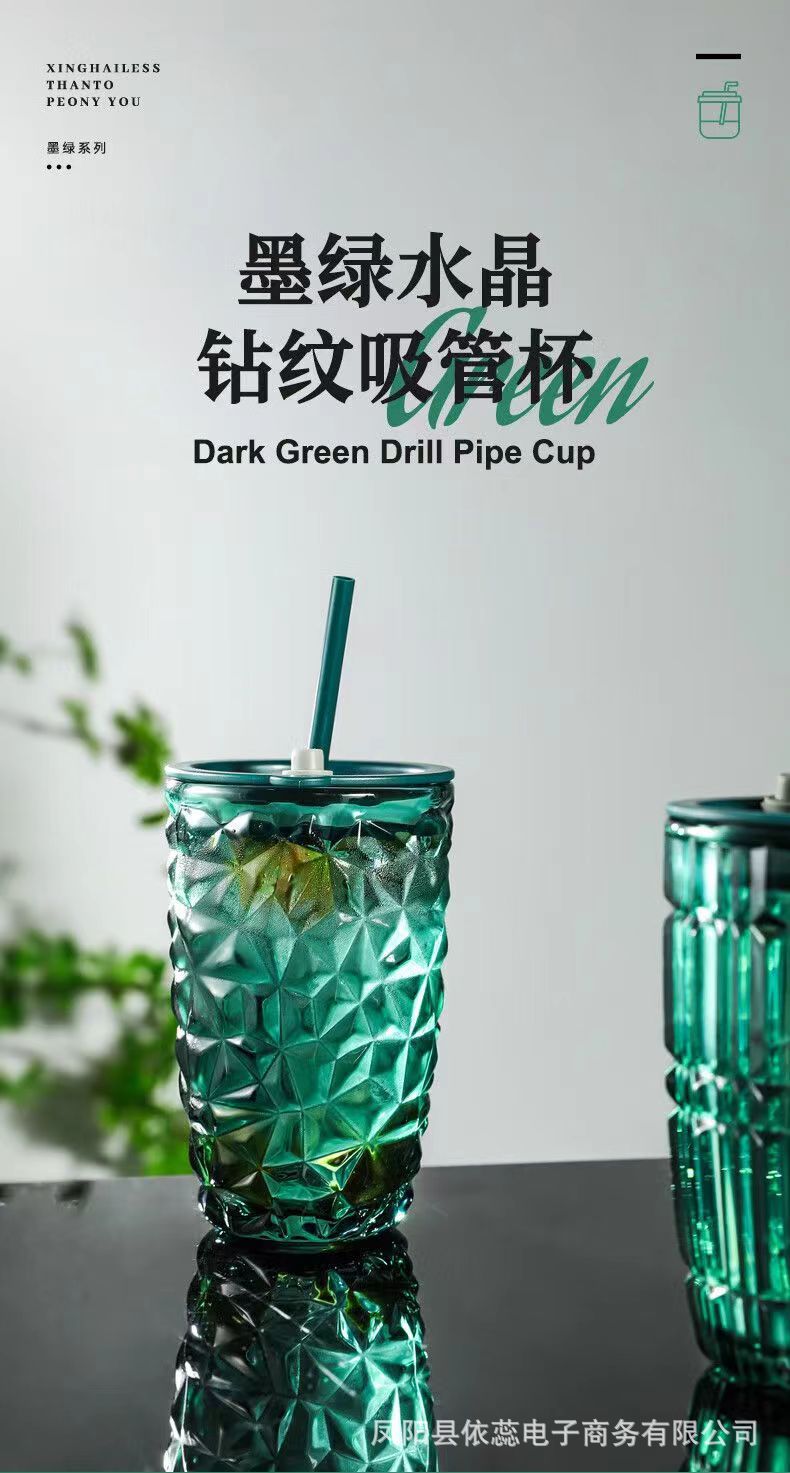 ネット赤ガラスストローカップ蓋付き墨緑ドリル模様大容量ストローカップ女子学生がすぐにコップミルクカップを飲む
