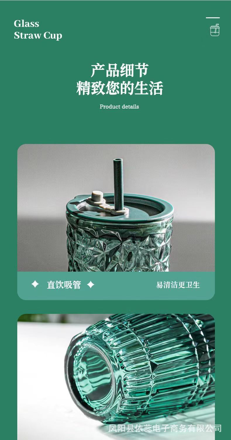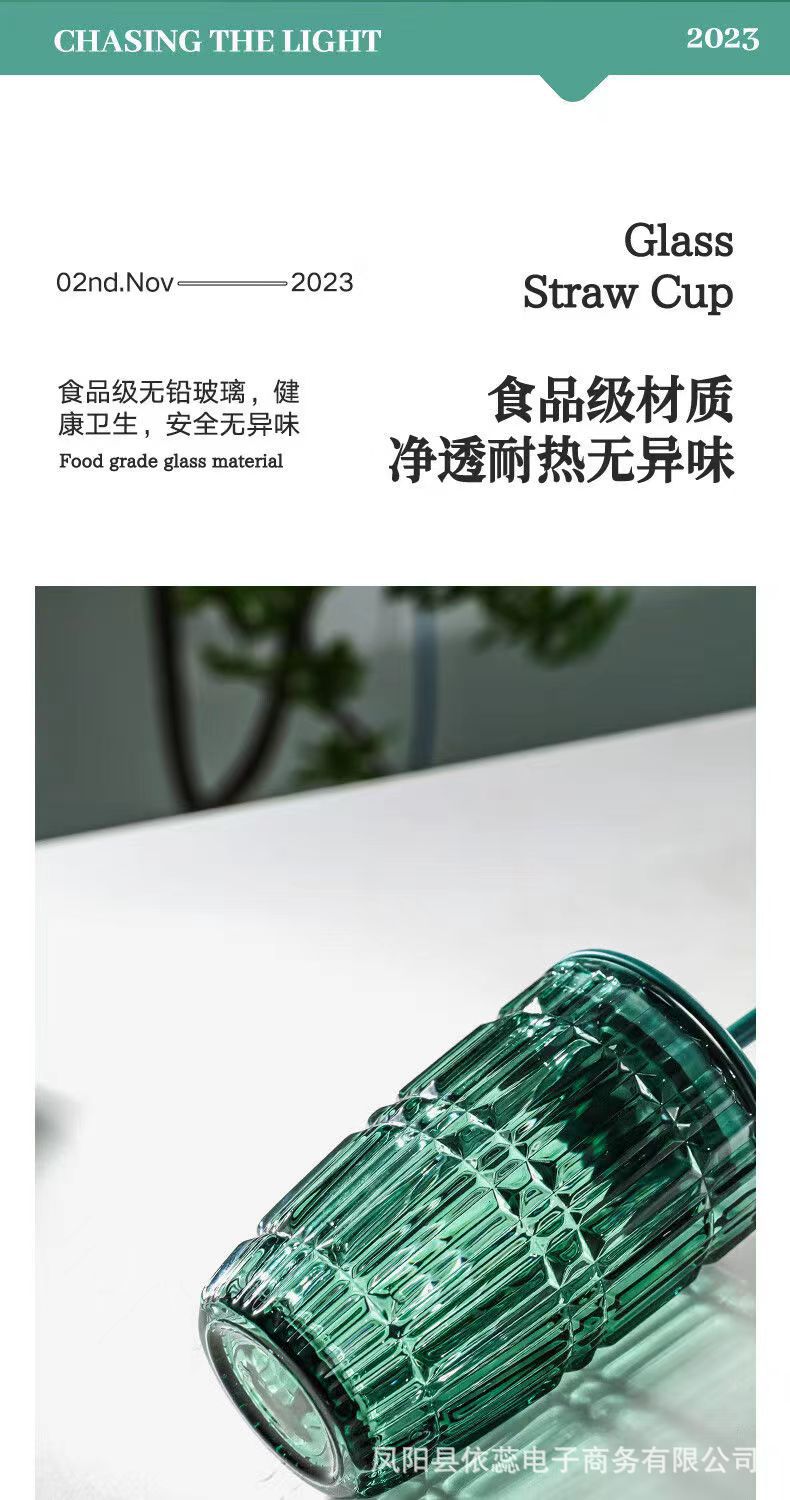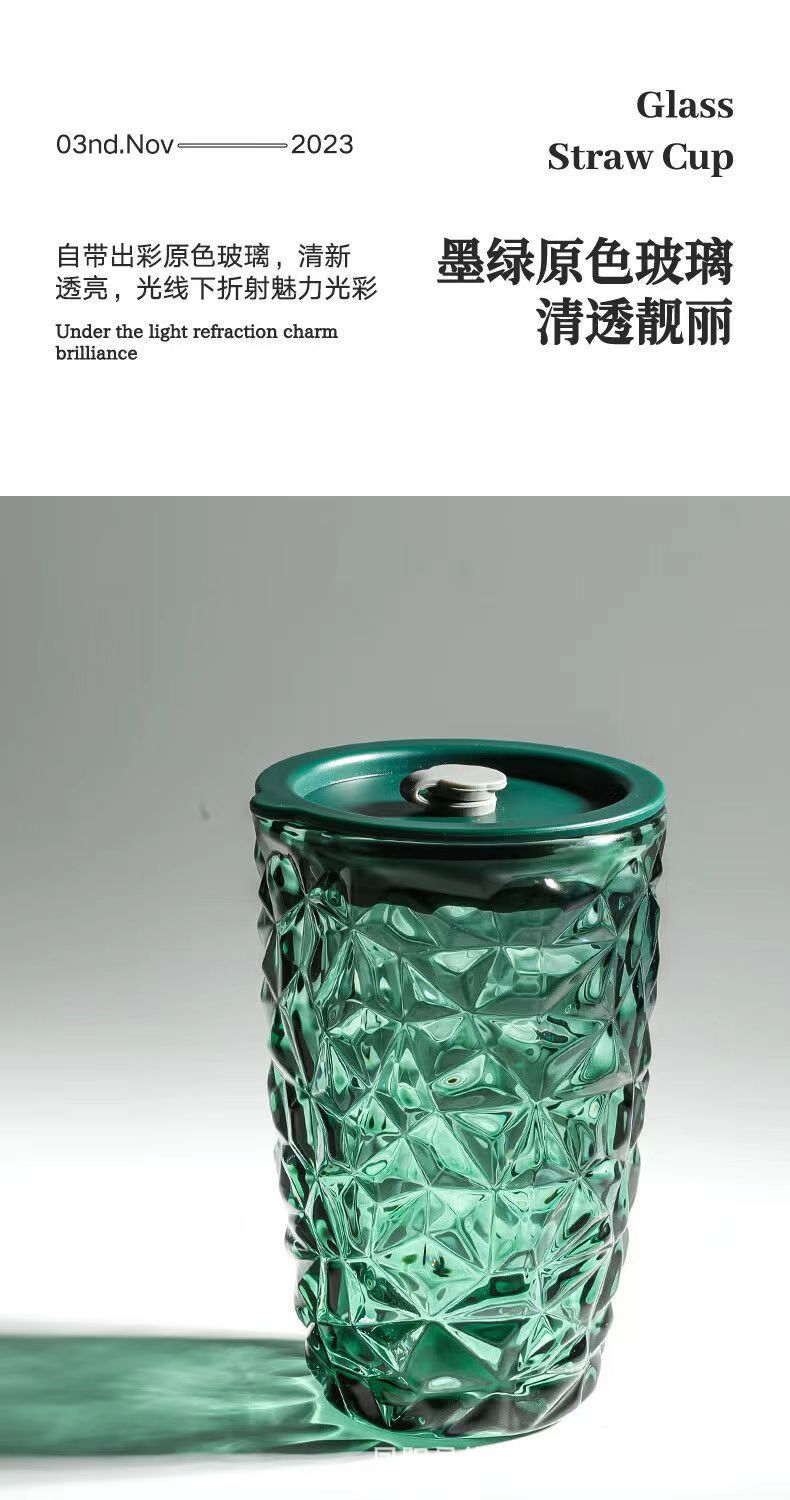 ネット赤ガラスストローカップ蓋付き墨緑ドリル模様大容量ストローカップ女子学生がすぐにコップミルクカップを飲む