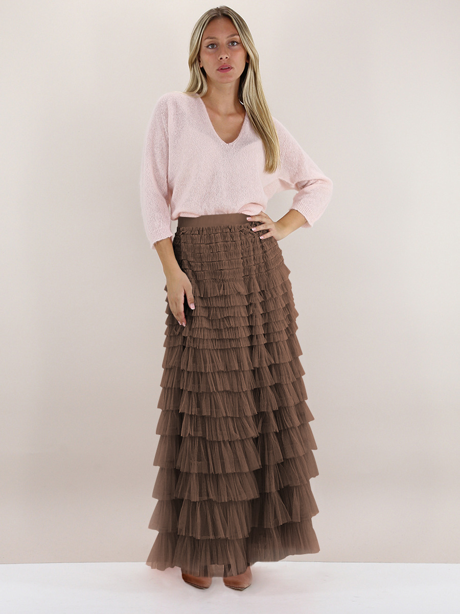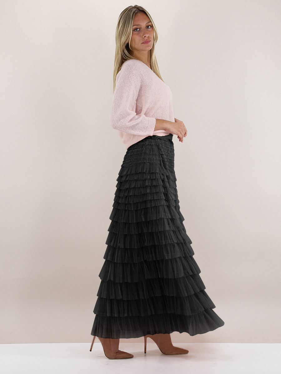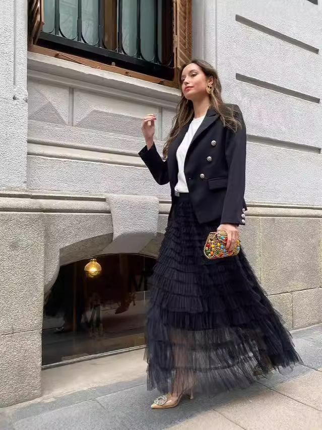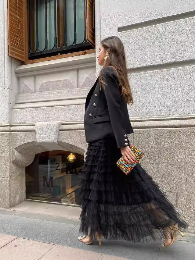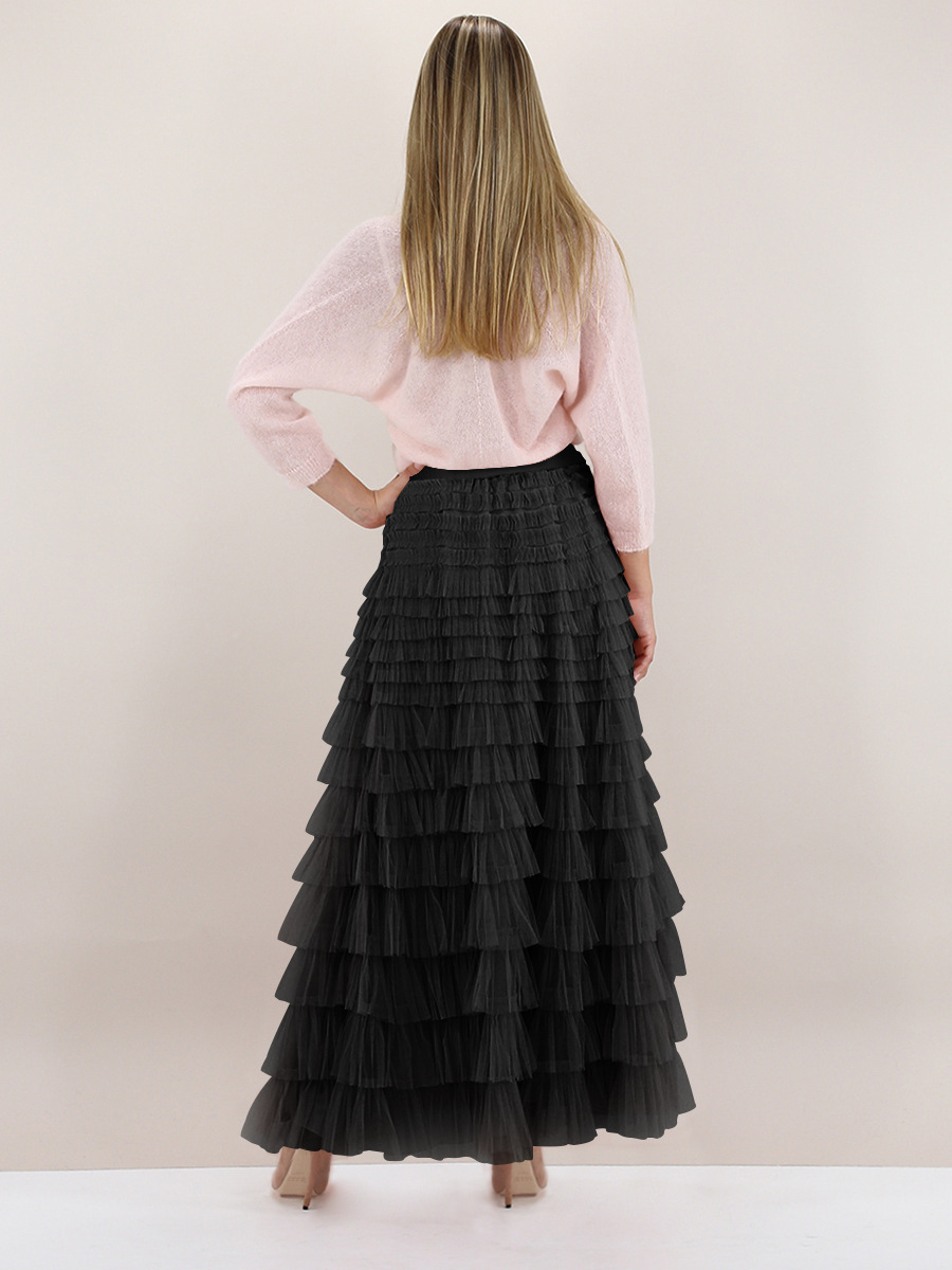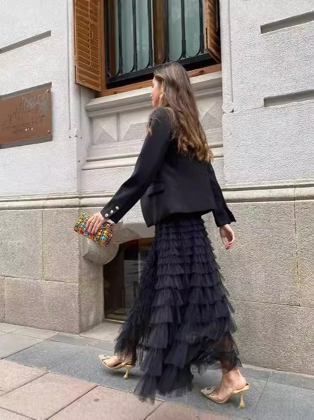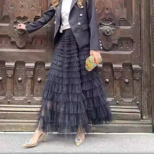 外国貿易の層のケーキのスカートのネットのスカートの半身のスカートの女性のデザイン感の小さい背の2025春夏の新型のA字の長いスカート
