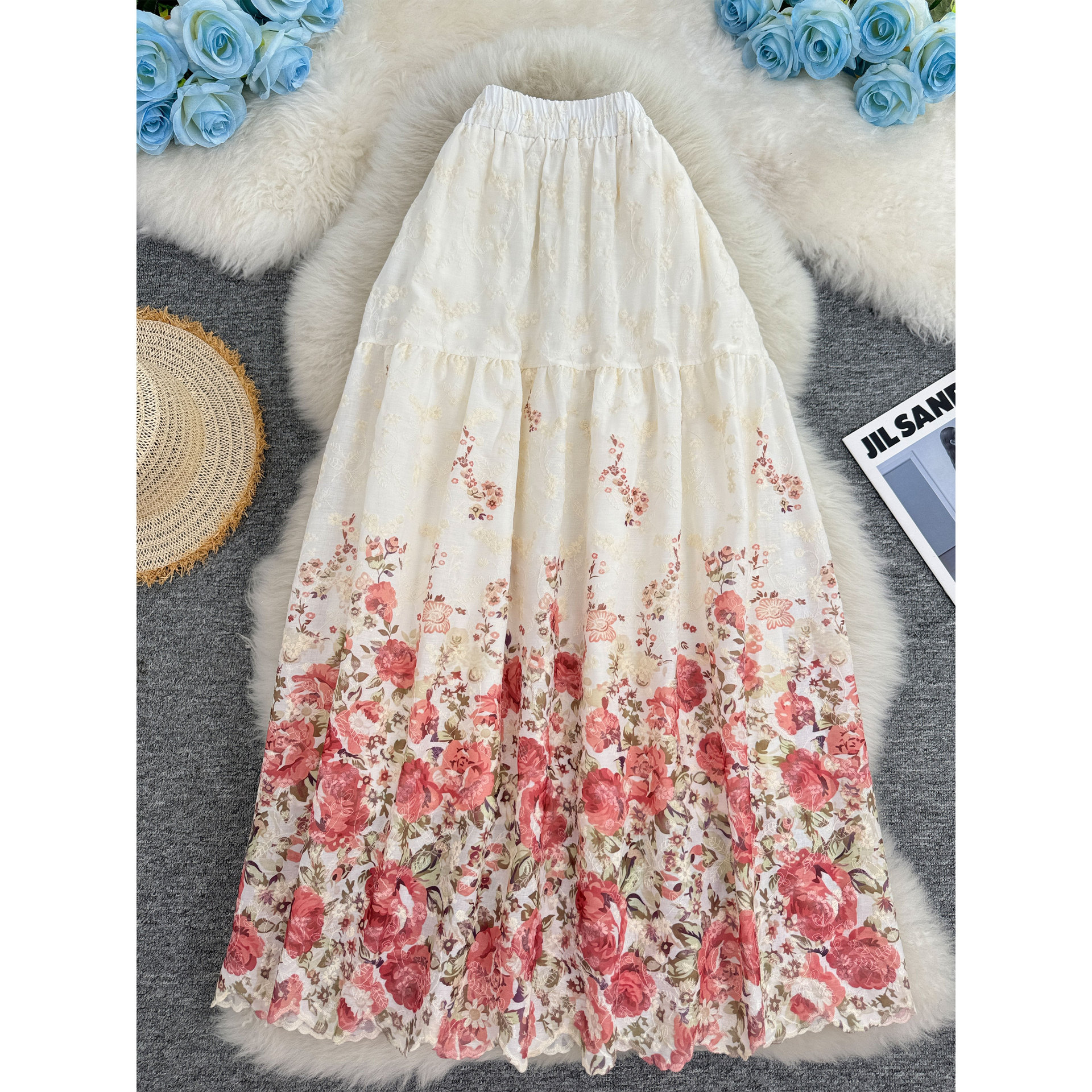 跨境韩系重工刺绣花卉拼接大摆半身裙温柔度假风A字中长款裙子女
