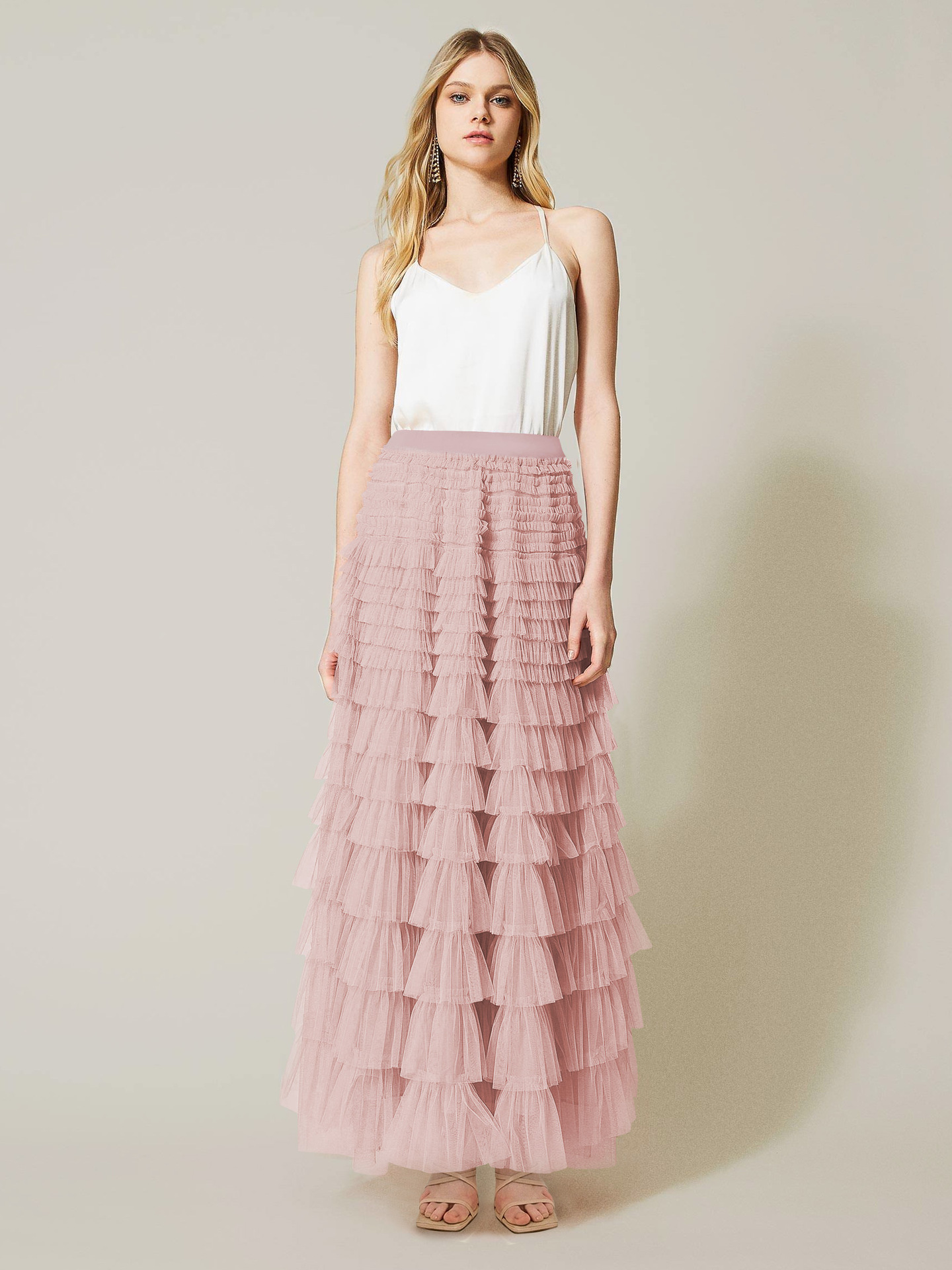 メッシュとプリーツの重ね着ケーキスカート、Aラインロングスカート、2025秋冬新作、高級感、小柄な方向け、万能