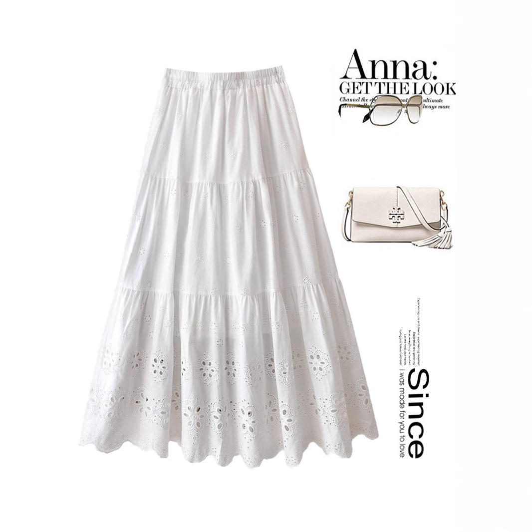 優しくて甘い透かし彫りの刺繍の大きい振り子のa字のスカートの白い半身のスカートの2025年の春夏の新型の高い腰の中で長いスカート
