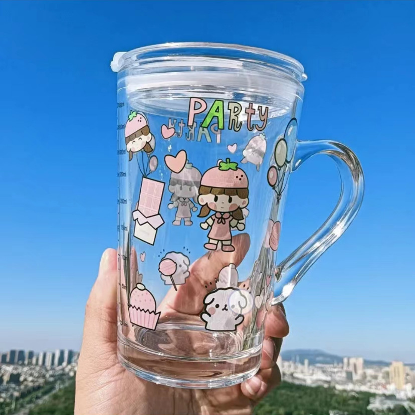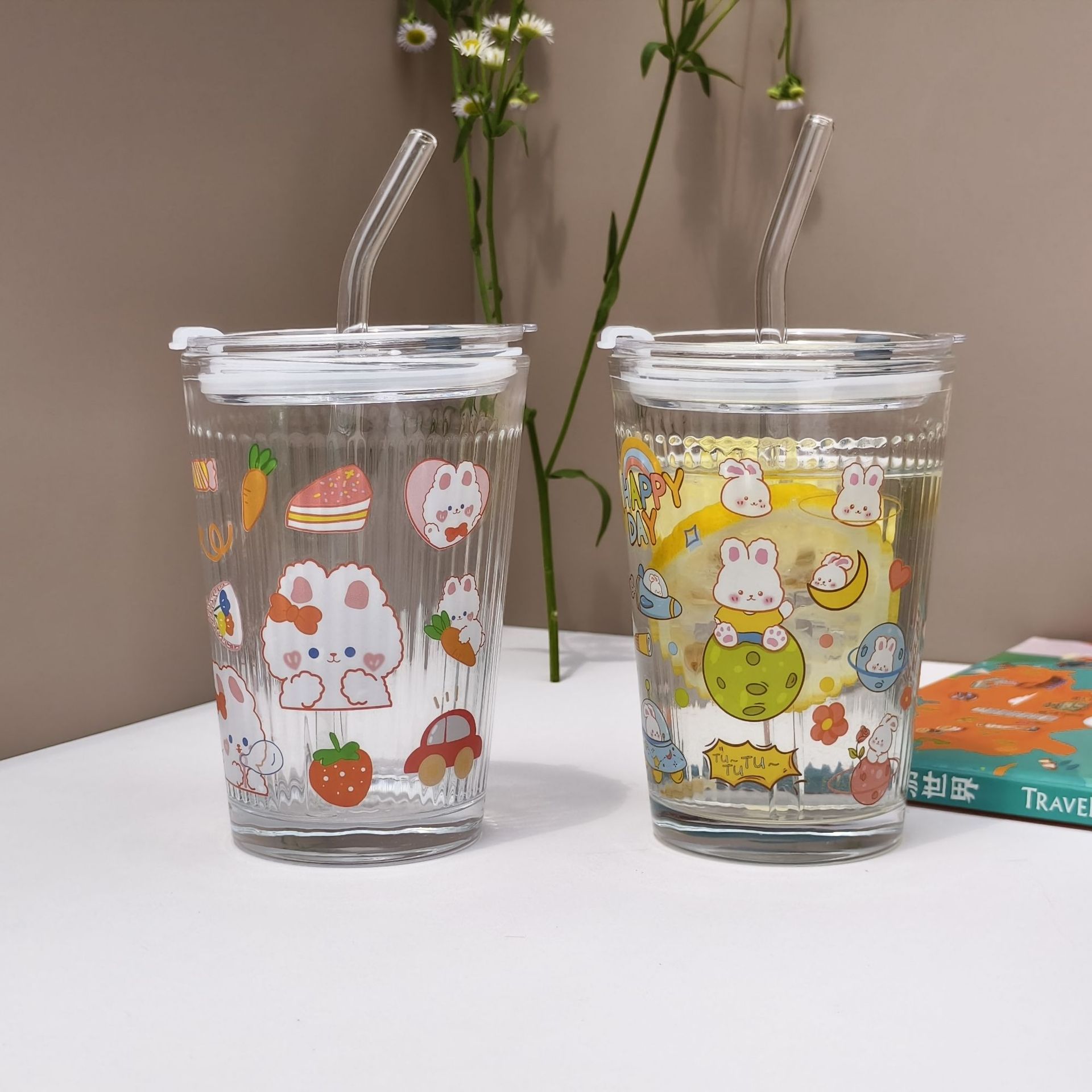 少女心玻璃吸管饮料杯带盖子可爱卡通果汁牛奶咖啡杯厂家直营批发