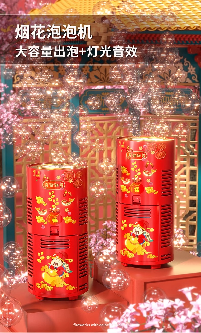 新年の花火の泡機の子供の全自動は爆竹の花火のネットの赤い照明の効果音の泡機のおもちゃをシミュレーションします。