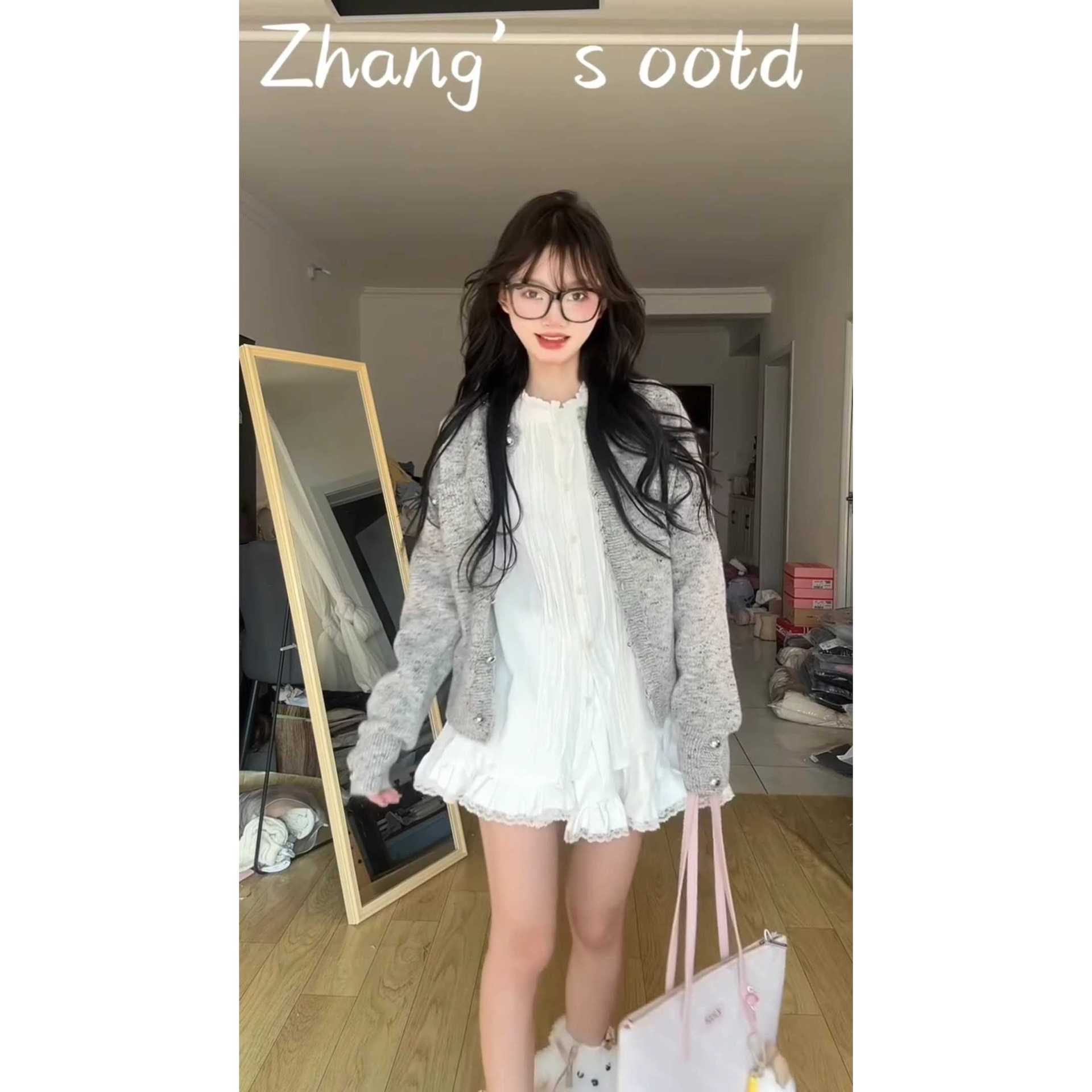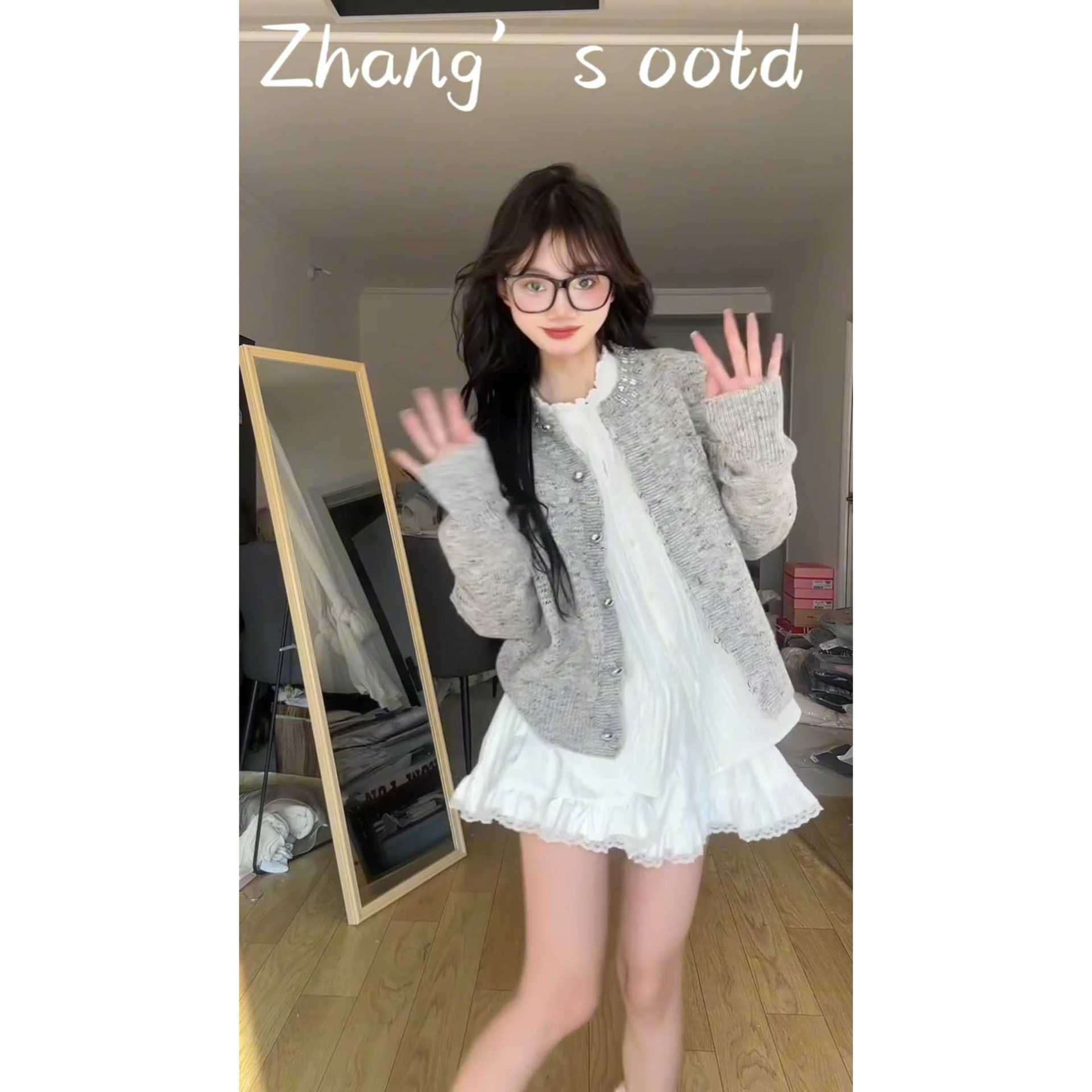 春の2025年の新型女性韓系高級感カーディガンの中に純欲コートのスカートを三点セット着ています。