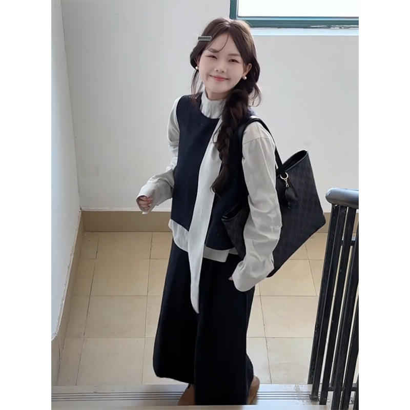 秋季新款韩系马甲背心叠穿飘带衬衫上衣阔腿休闲裤套装