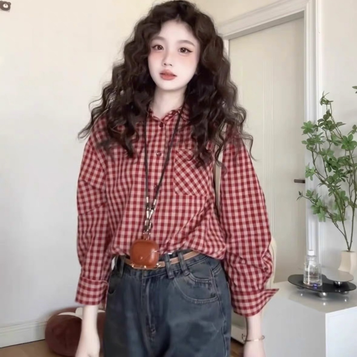 韩系复古红色格纹衬衫外套女春秋休闲宽松气质设计感防晒衬衣上衣
