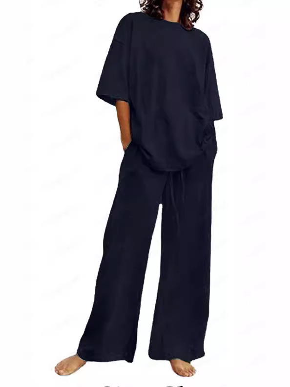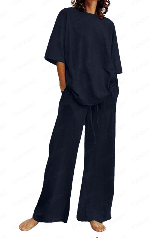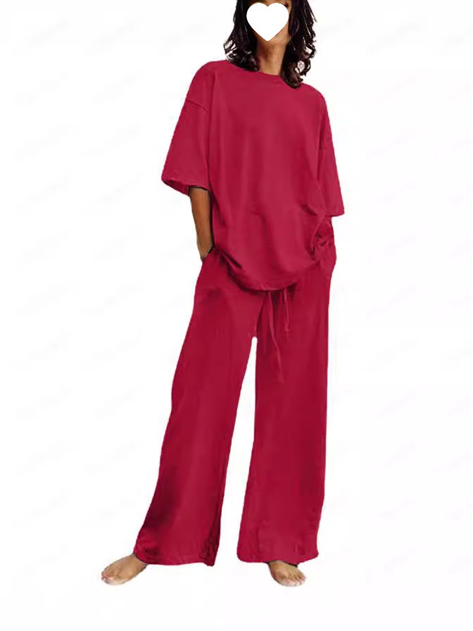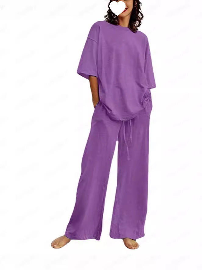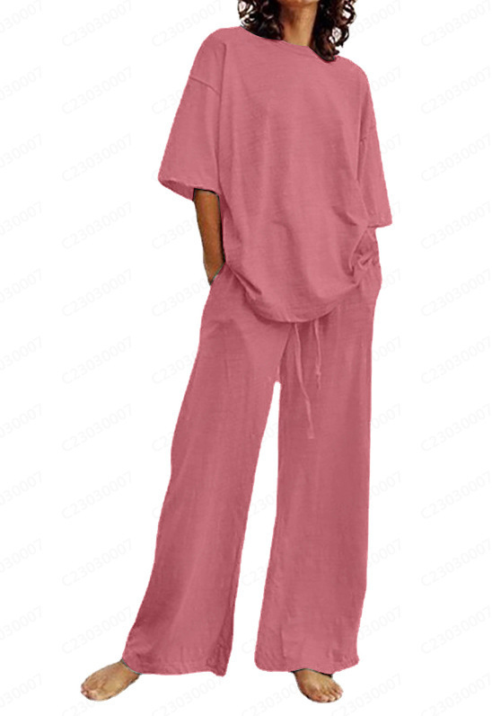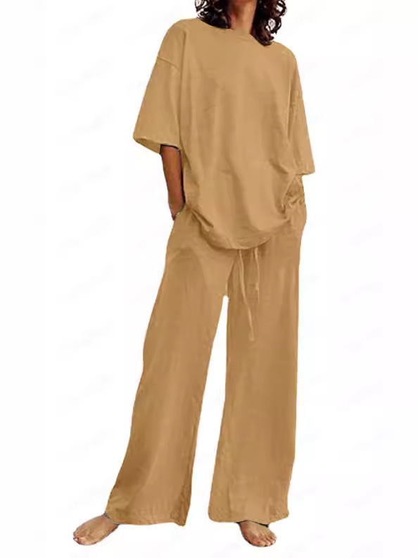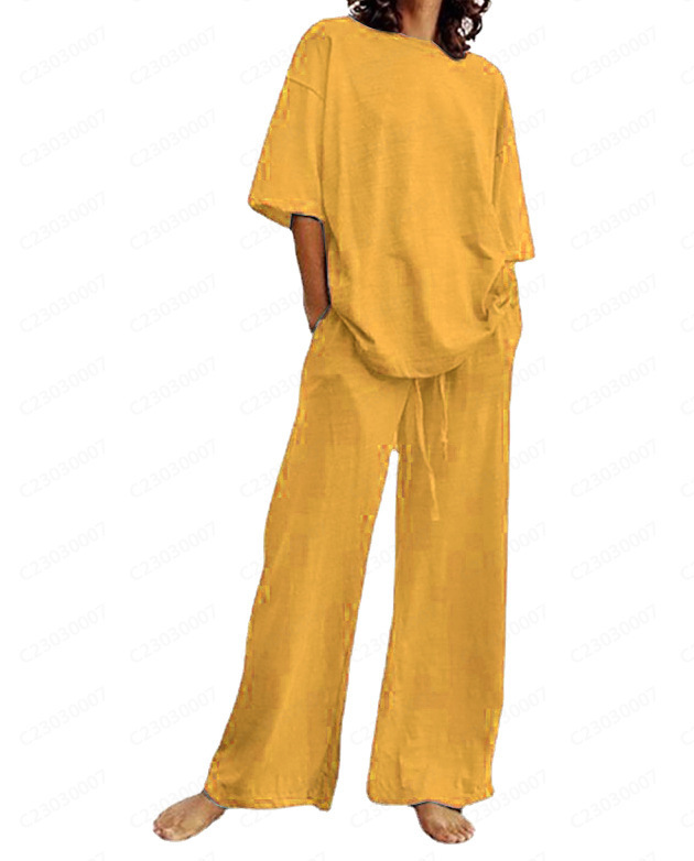 2026年夏向けのおしゃれなレディース2点セット、カジュアルなベルト付きポケット付きセット、半袖Oネックトップスとワイドパンツのセット