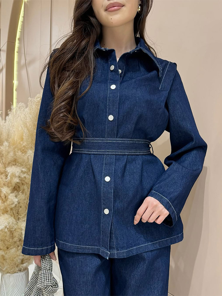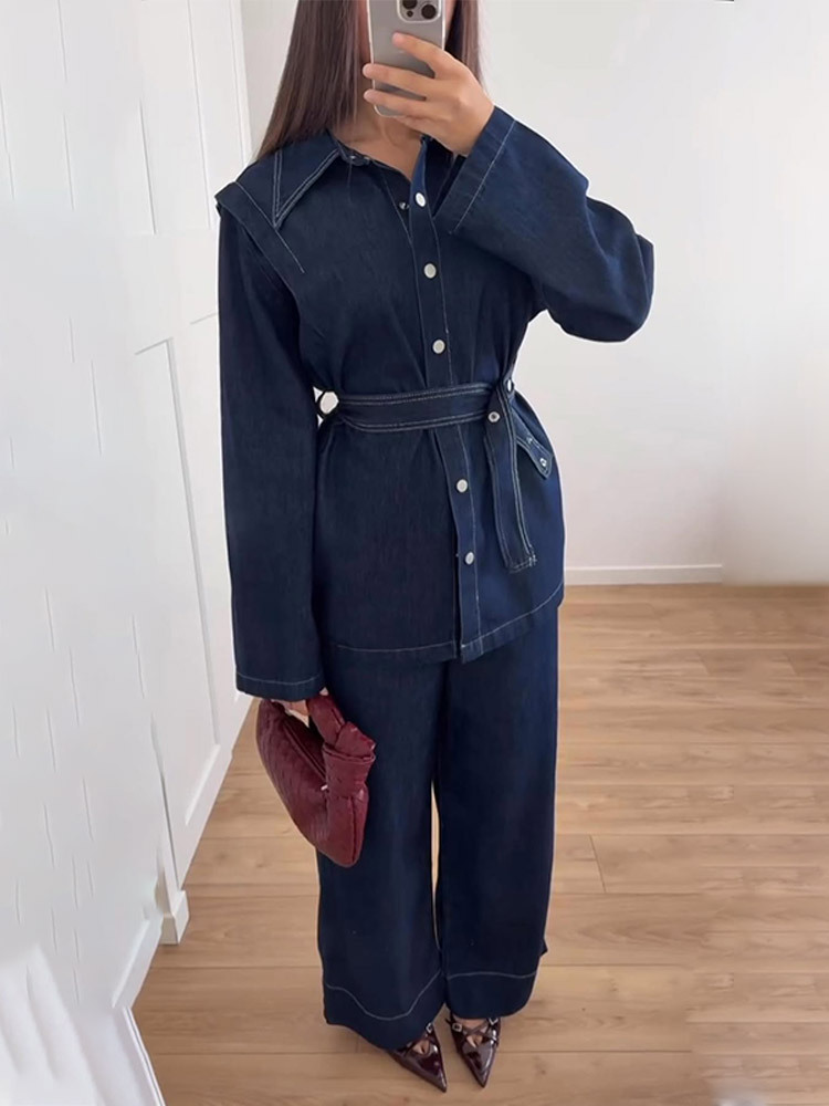 実物写真-襟付きデニムの紐付きツーピースセット、欧米風クロスボーダーファッション、人気のファッションカジュアルレトロ万能セット