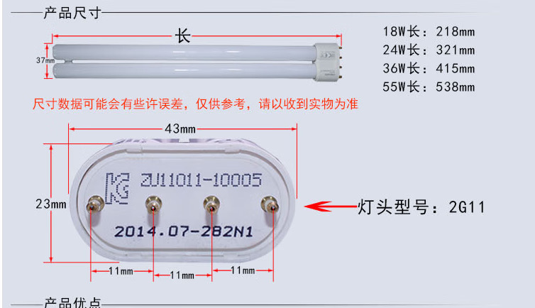 11瓦台灯灯管两针U型 led台灯荧光2针平四针浴霸照明方四针护眼9W
