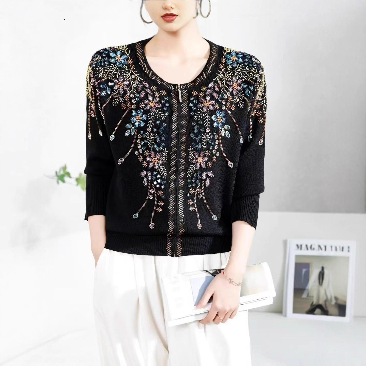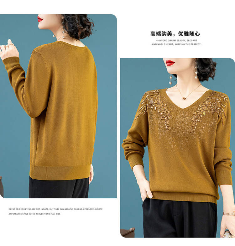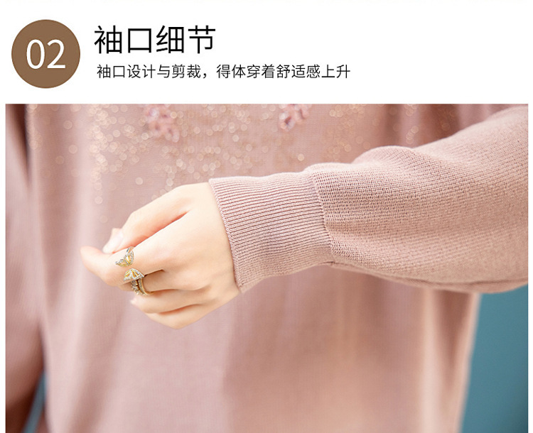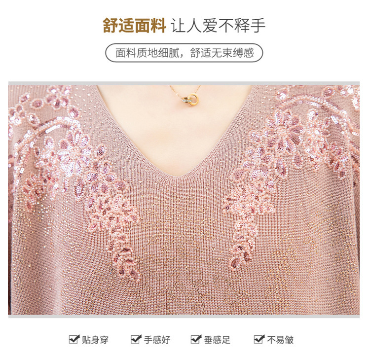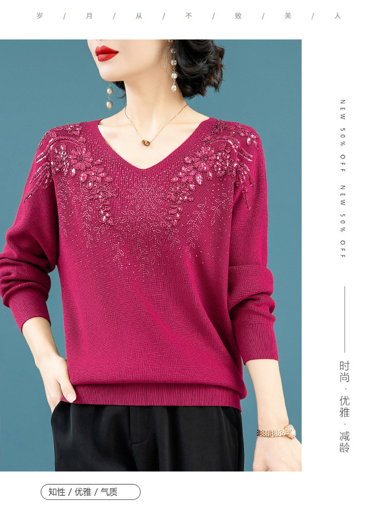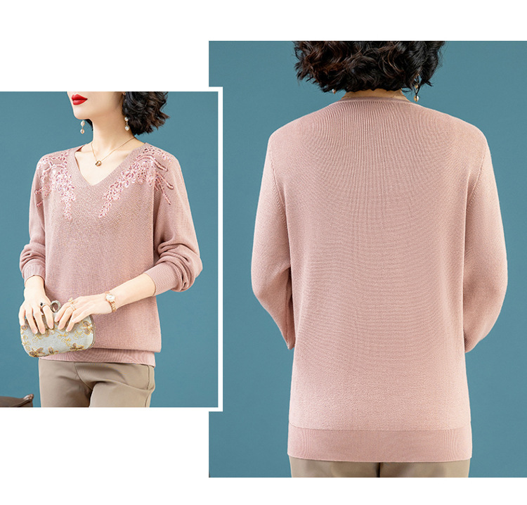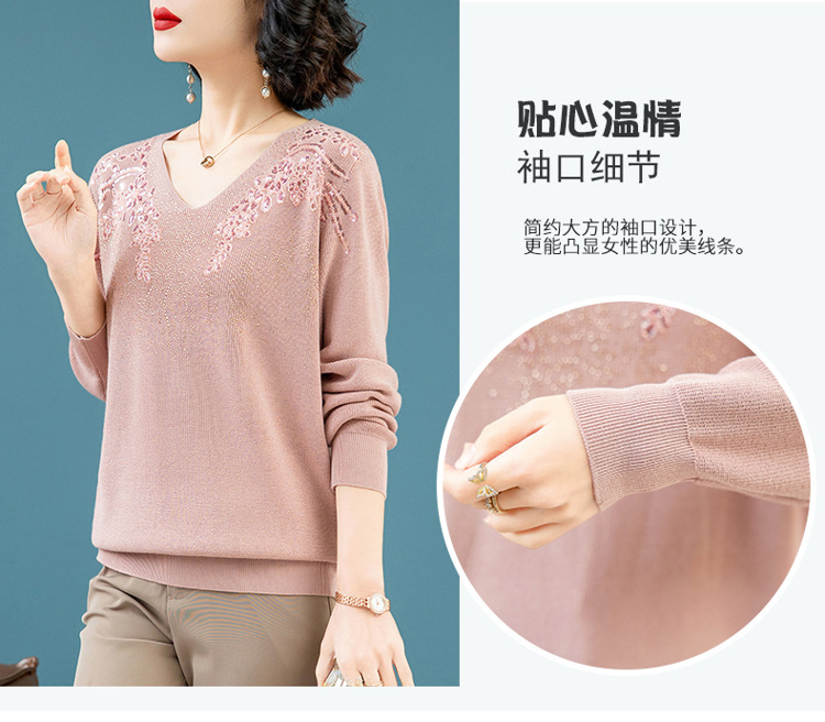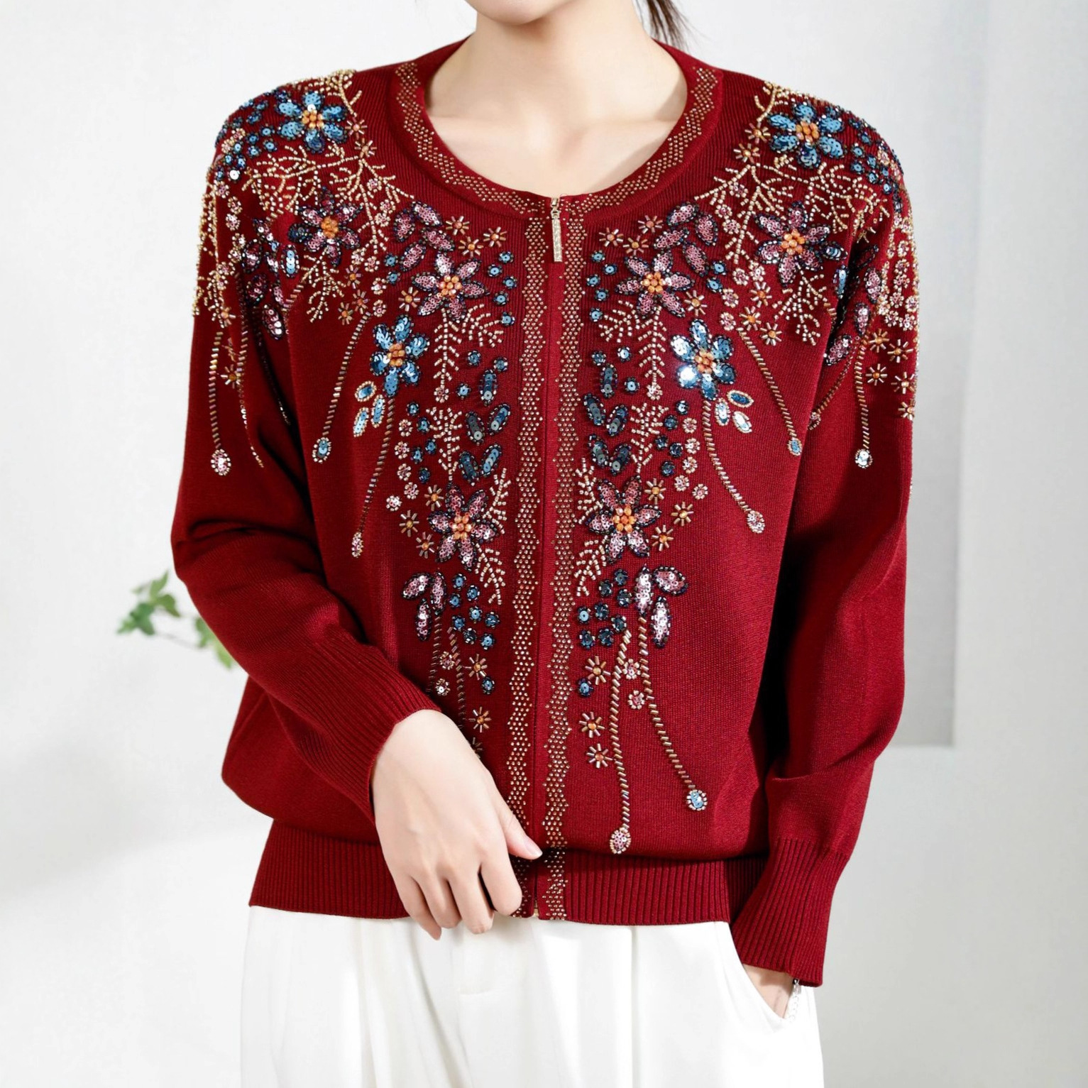 2025年秋冬新款冰丝针织毛衣重工秀珠长袖上衣中老年妈妈开衫圆领