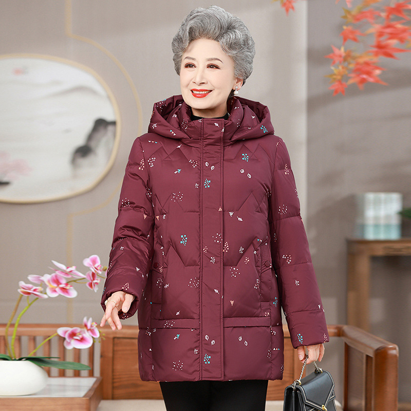 高齢者のお母さんのダウンジャケットの中の長いタイプの冬服のコートの女性のおばあさんのファッションのプリントの秋冬の帽子の保温の上着