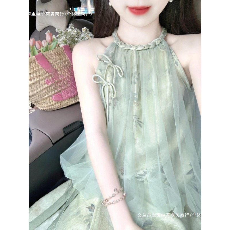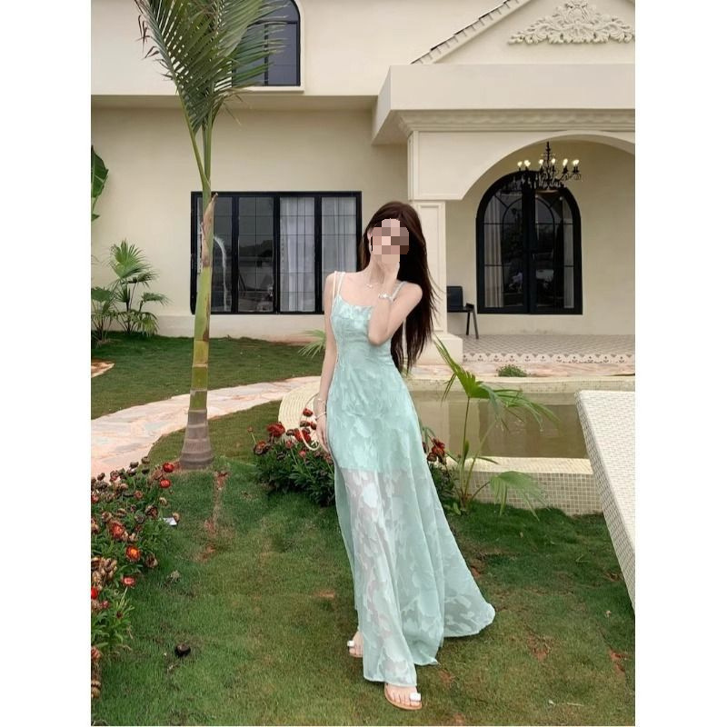 海辺のリゾートスタイルの女性用グリーンサスペンダードレス、夏の気質、メッシュパッチワークウエスト痩身スカート、ロングスカート