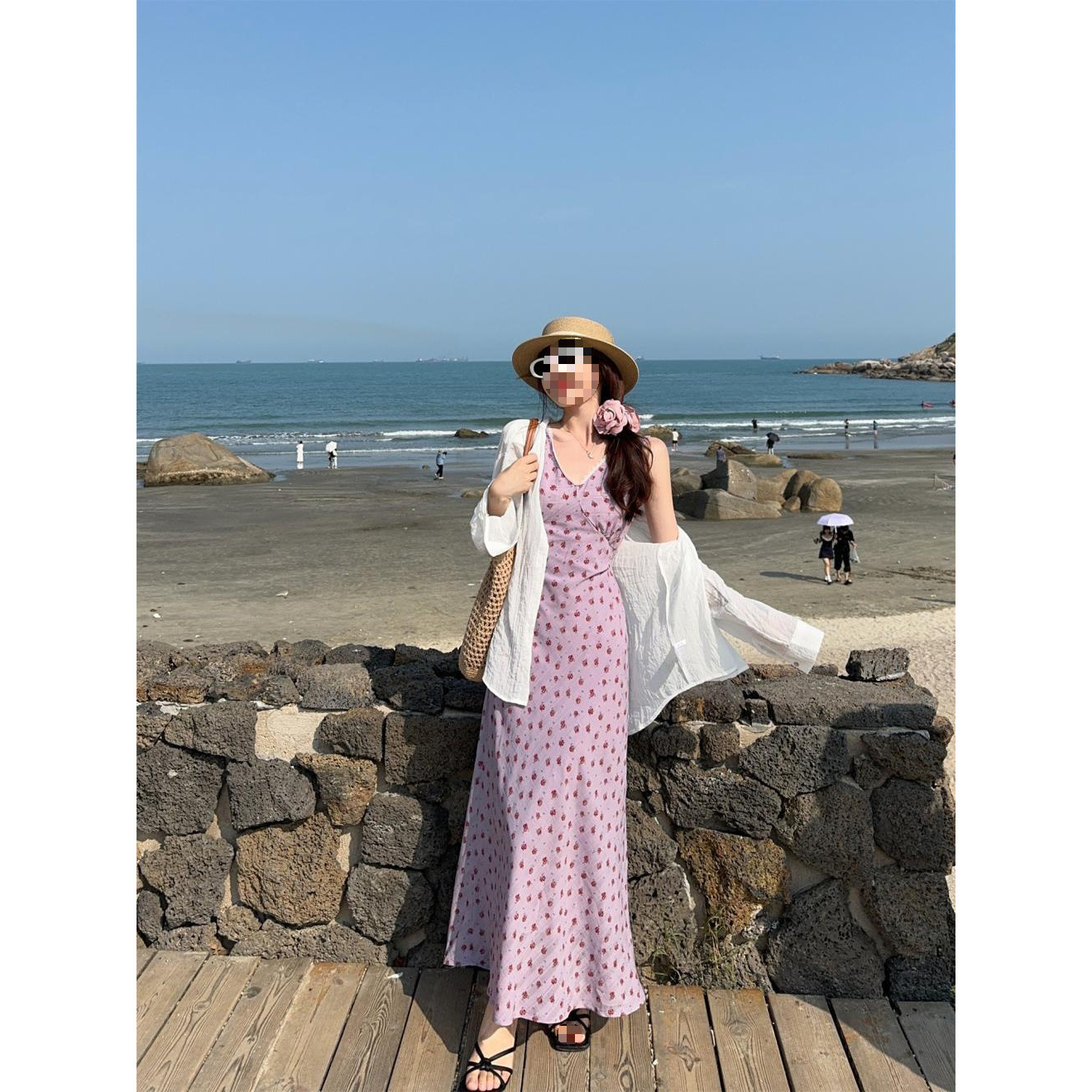 リアルショットとリアルプライス 2025 新しい夏スタイルの海辺のリゾートスタイルの襟花柄ウエストノースリーブドレス + 薄い日焼け止め