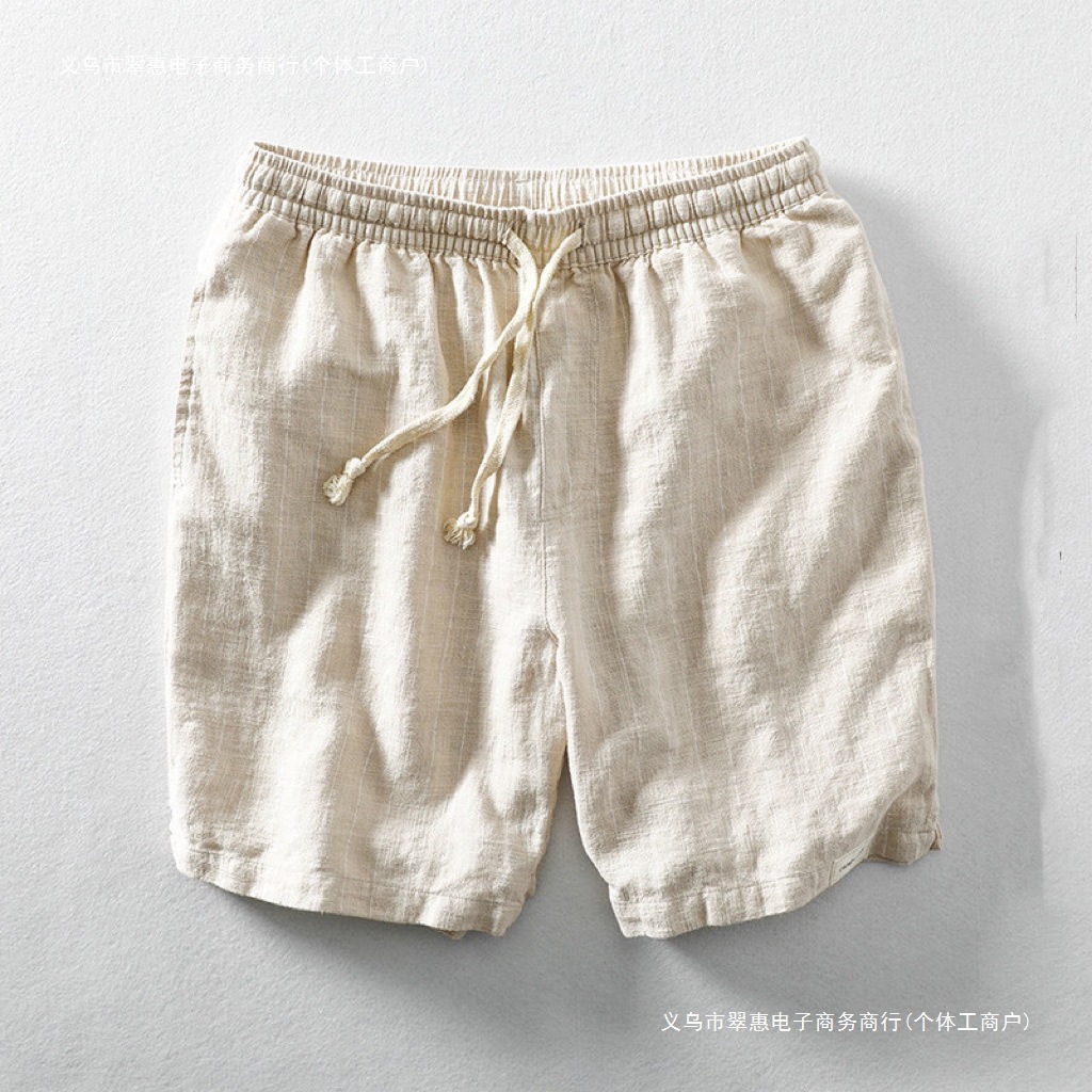 リネンショートパンツ男性夏ストライプスポーツパンツ綿麻布排汗ワイドストレッチ帯五分ビーチパンツ中ズボン潮