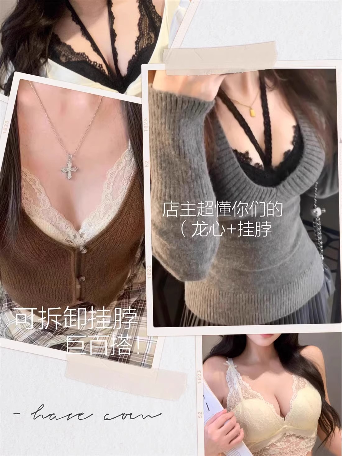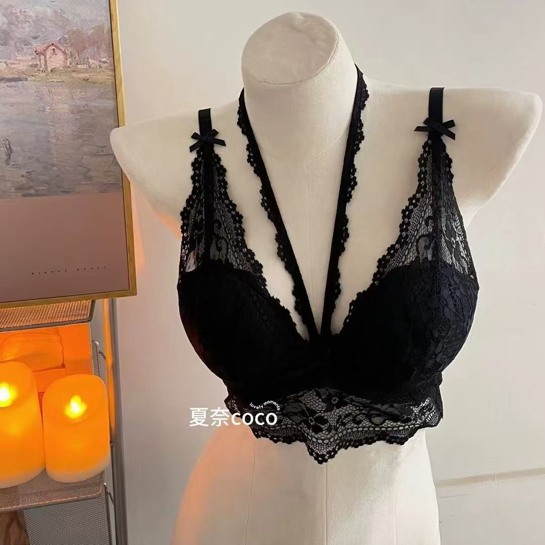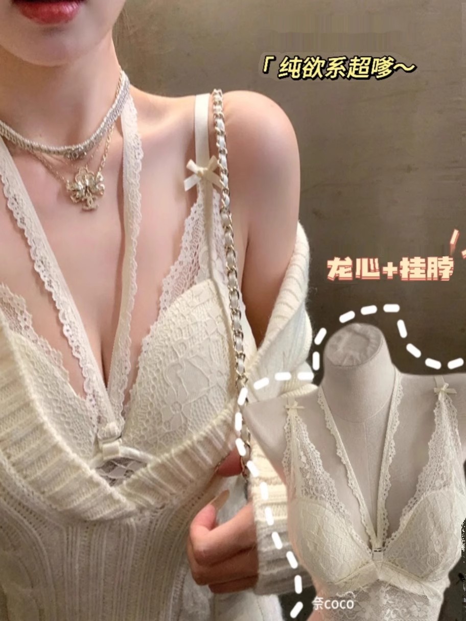法式纯欲心机挂脖蕾丝内搭内衣女小胸聚拢显大不空杯打底吊带文胸
