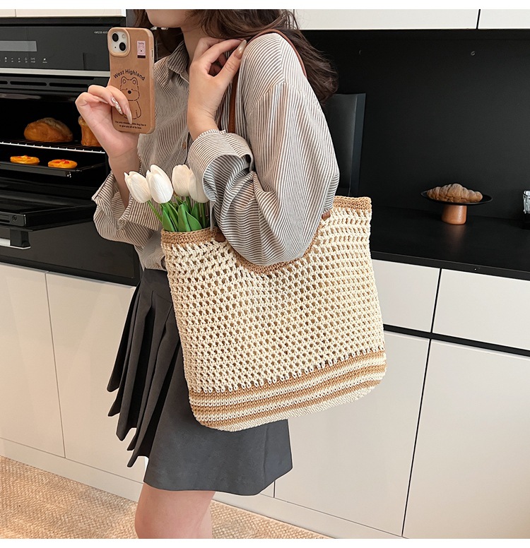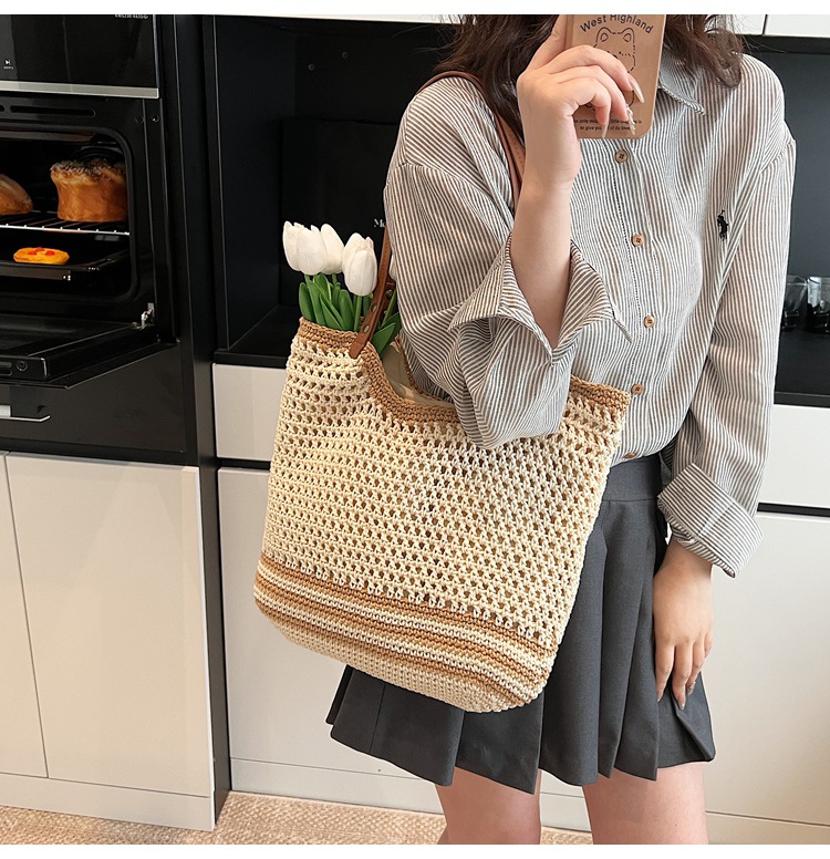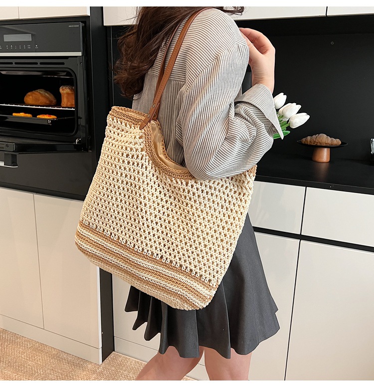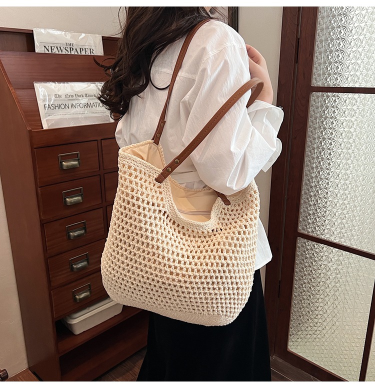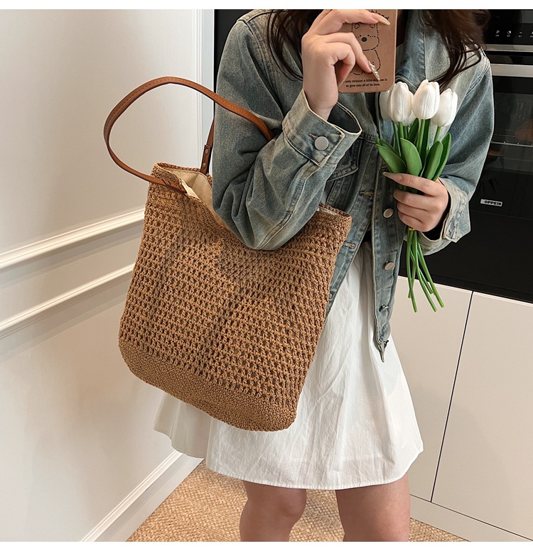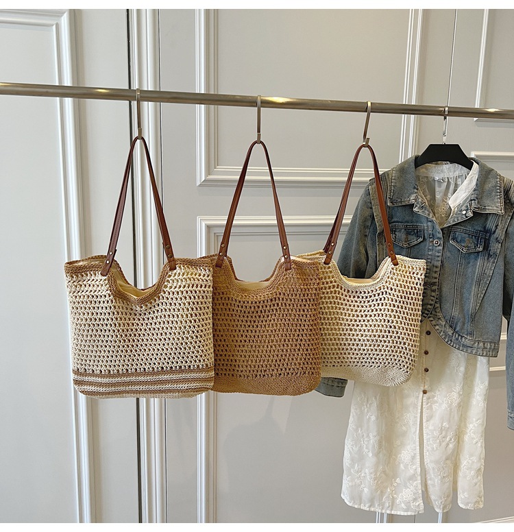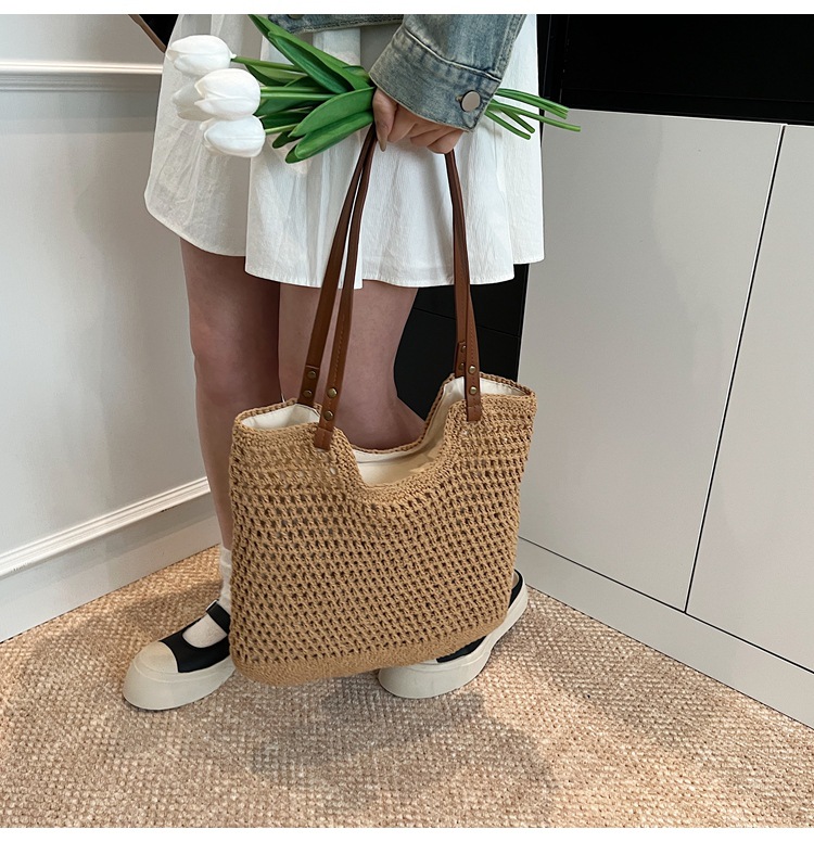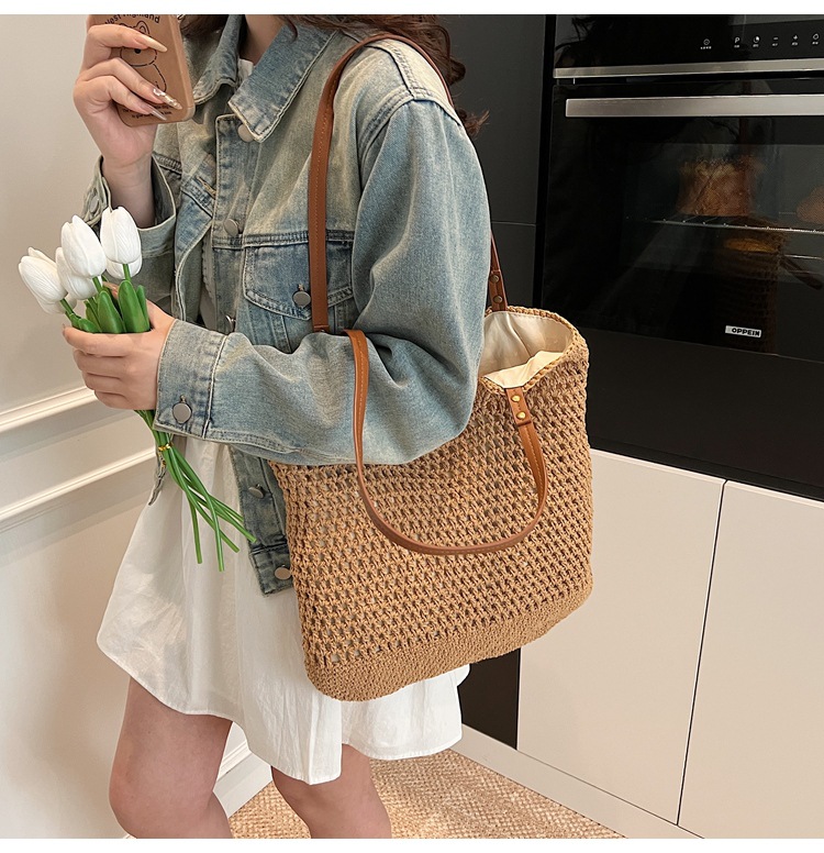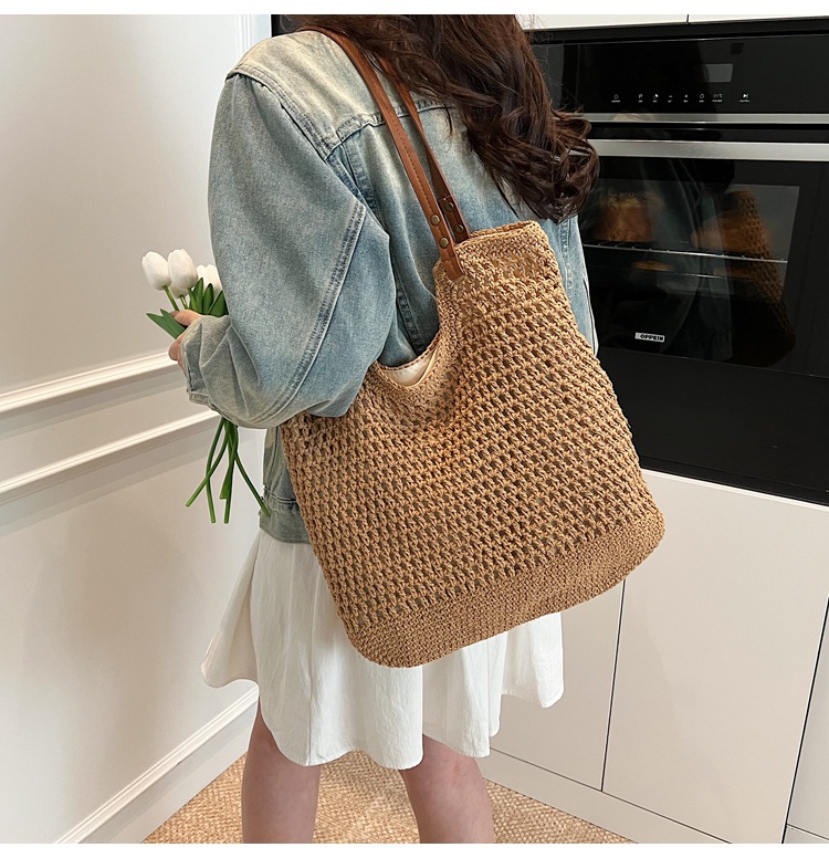 大容量バッグ女性2025新型百合シングル肩海辺休暇ビーチバッグ編み草編通勤バッグ