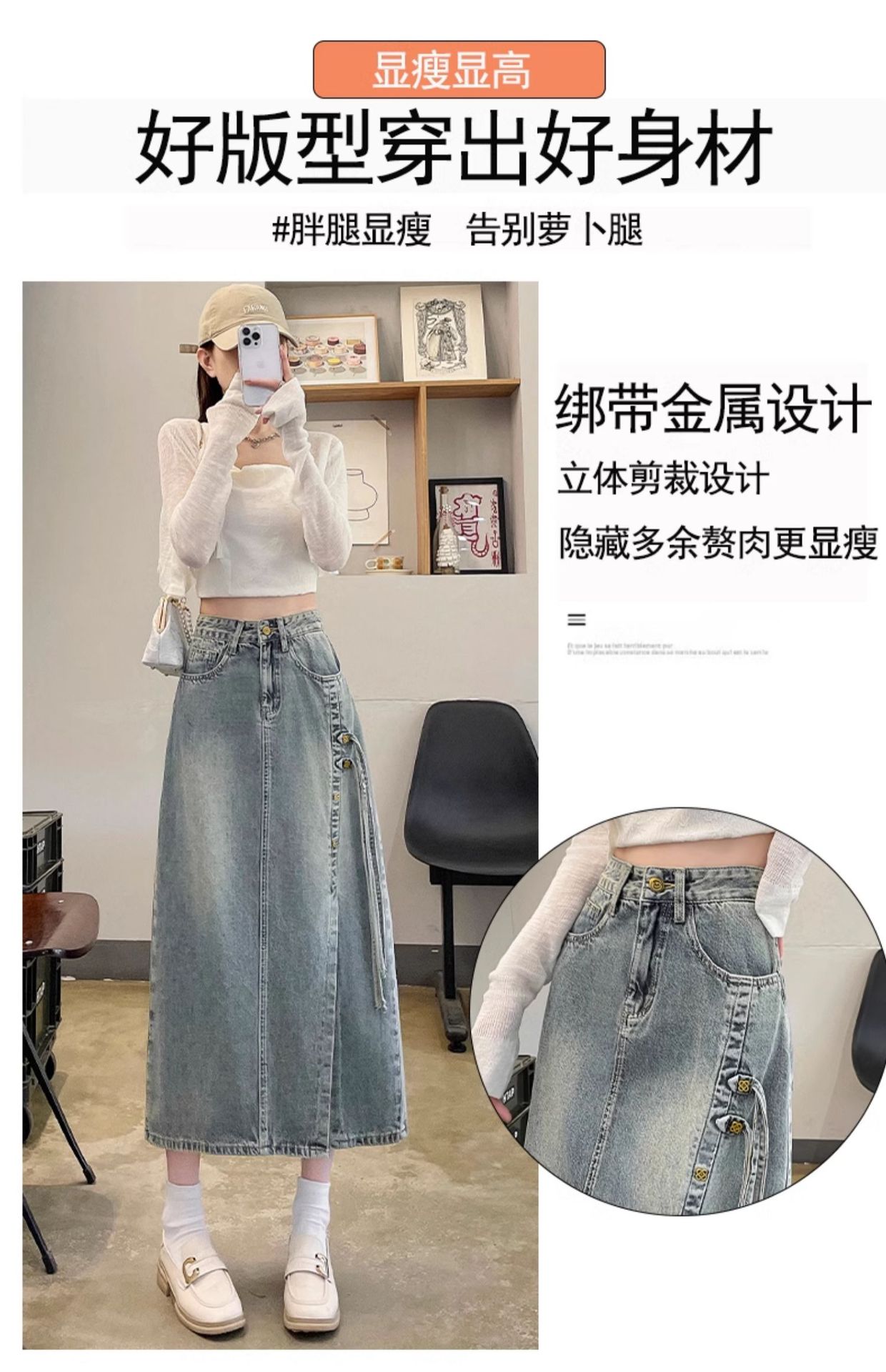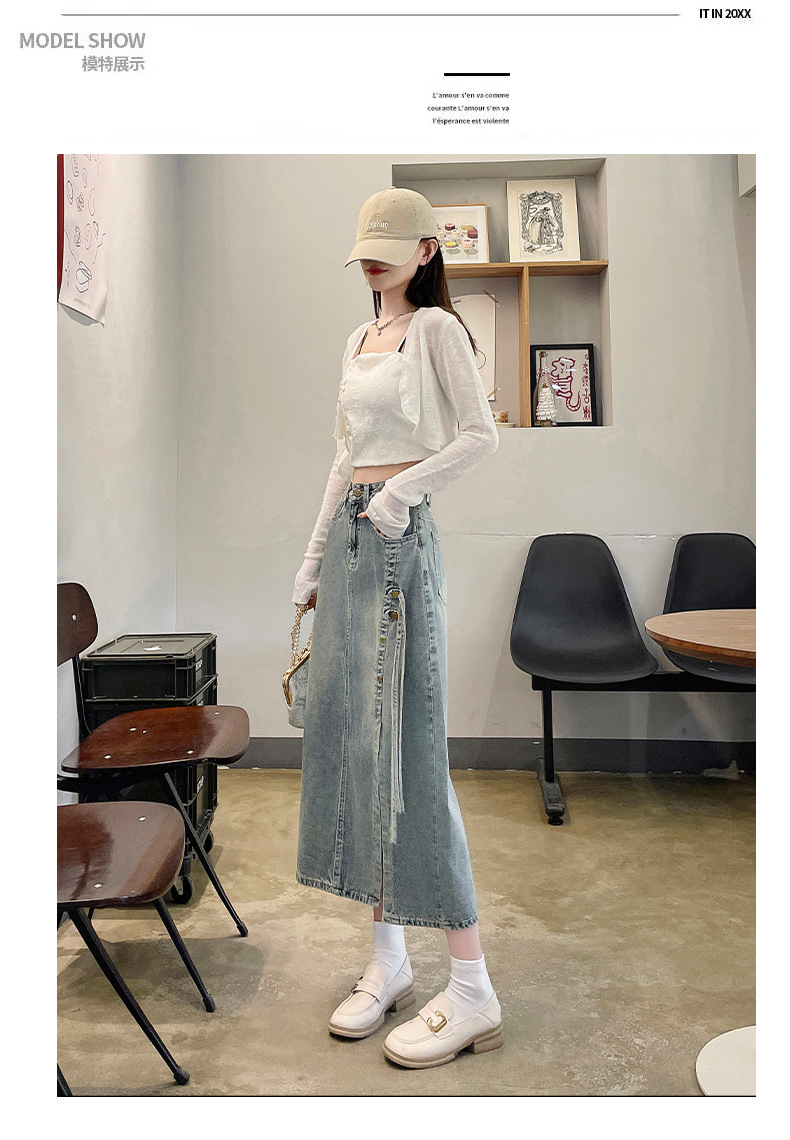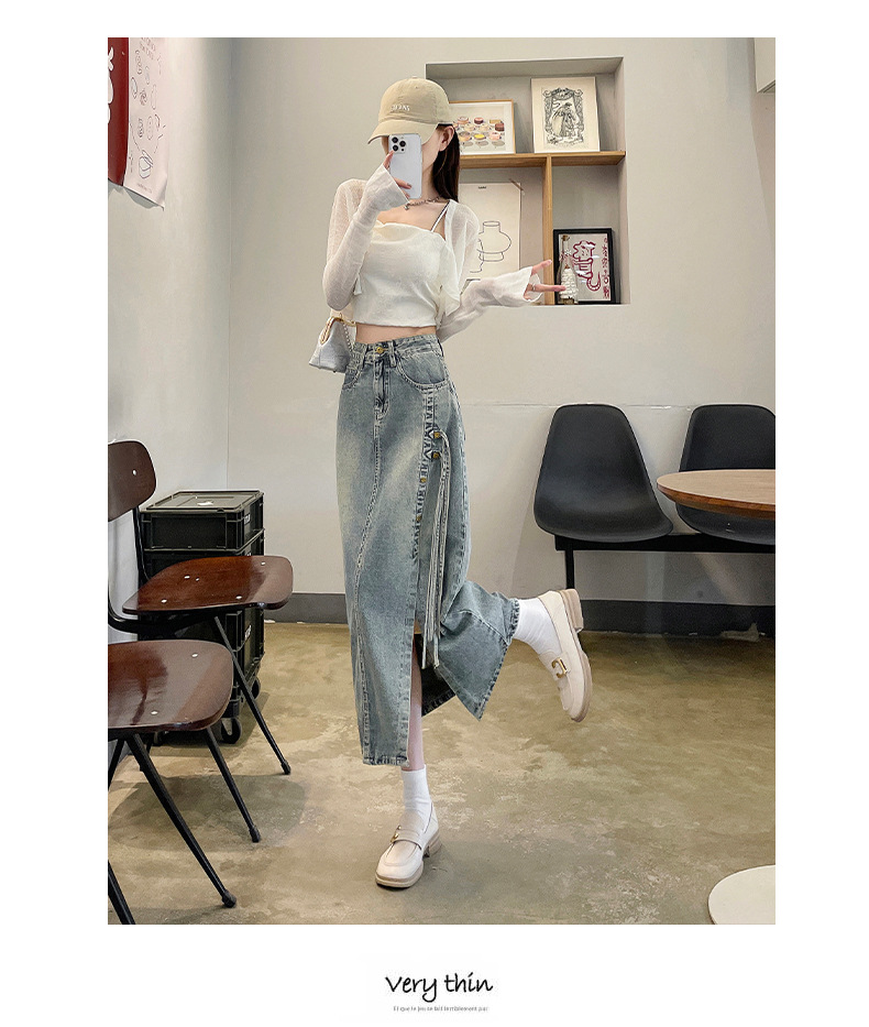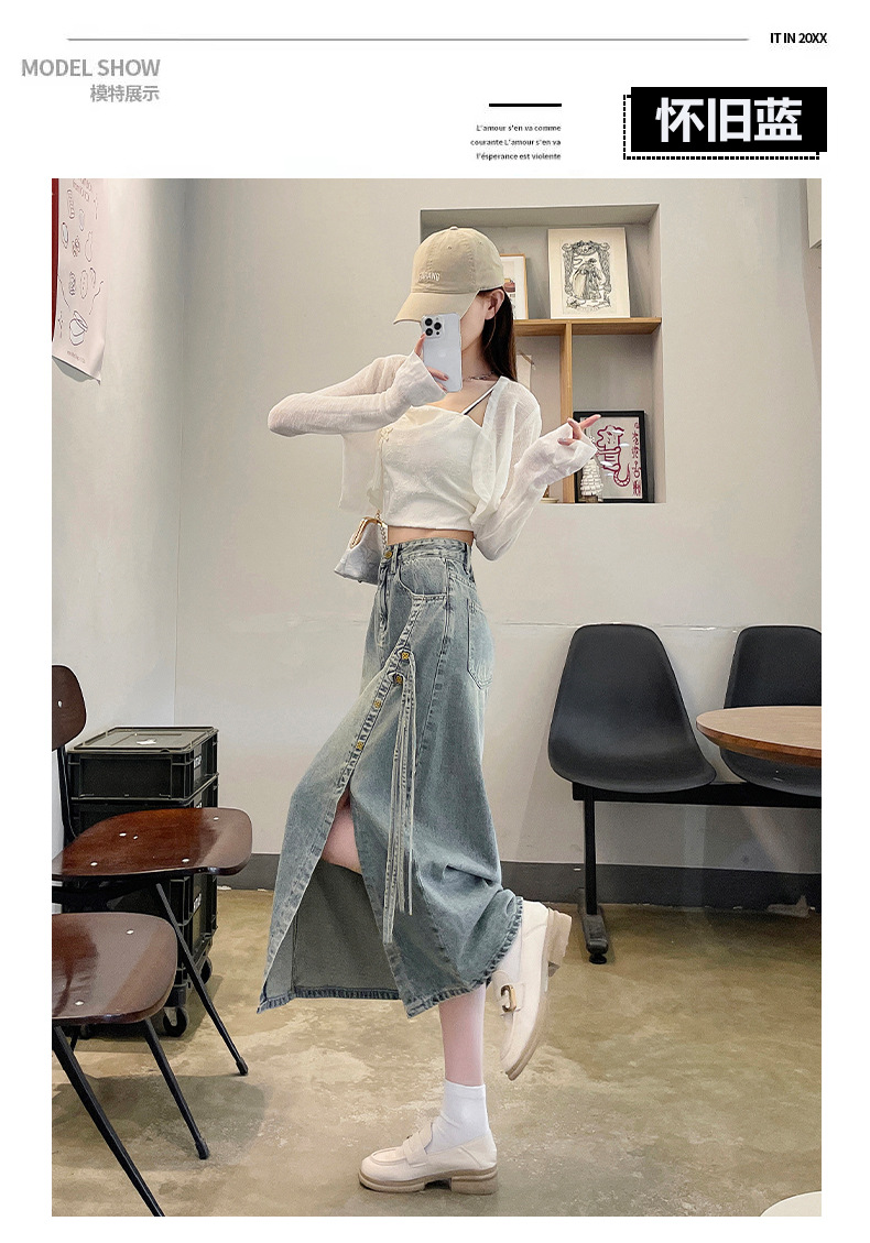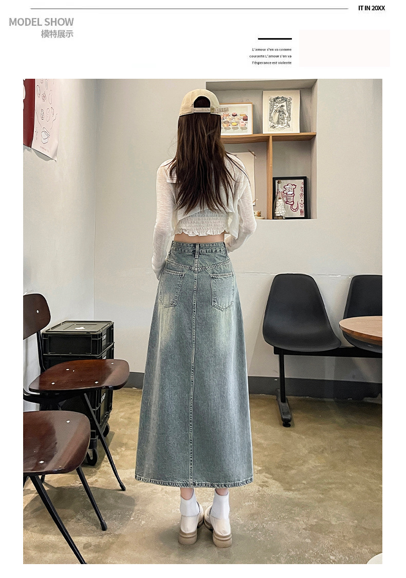 新商品のレトロなオープンデニムスカートの女性は腰が高くて痩せています。