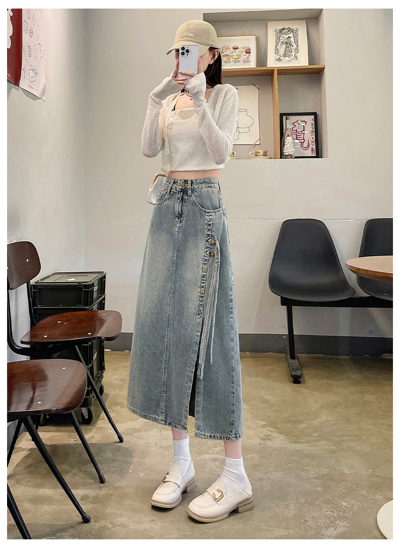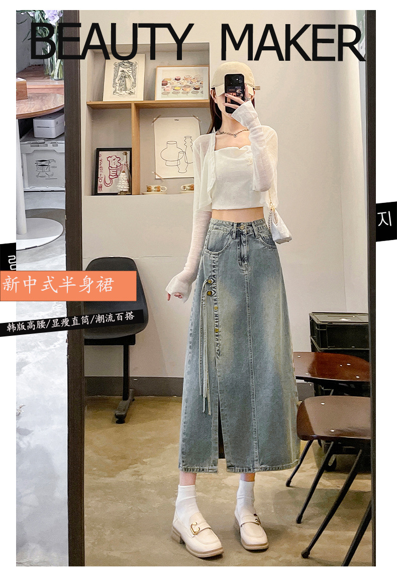 新中国式デニムスカート女性2025年春装新作ハイウエストミディアムロング国風a字オープンフォークヒップスカート