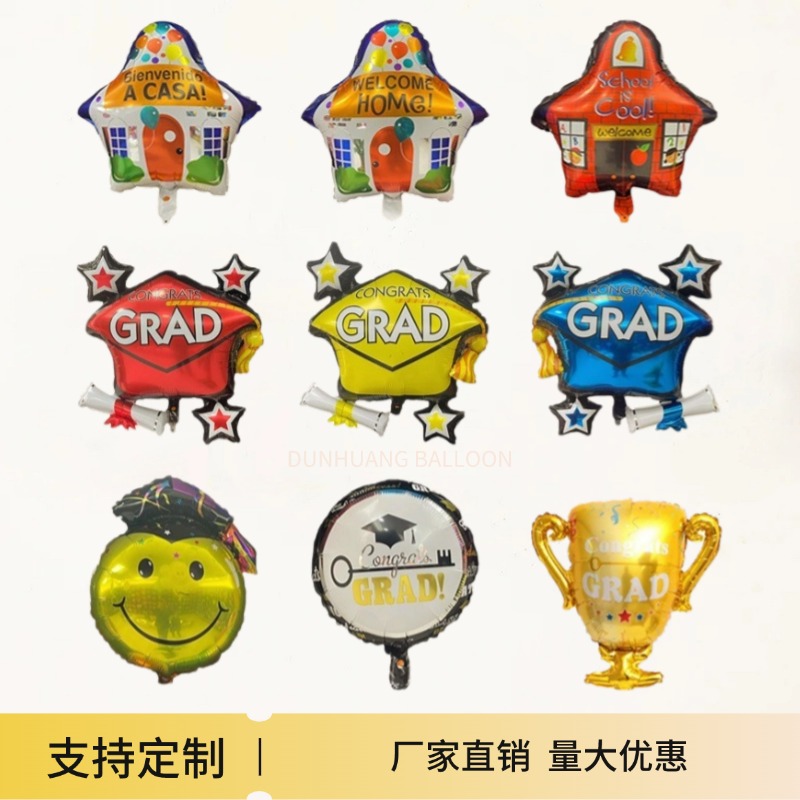 卒業式の造形学校のテーマ博士の卒業シーズンの学生はトロフィーのキャンパスの卒業風船を飾っています。