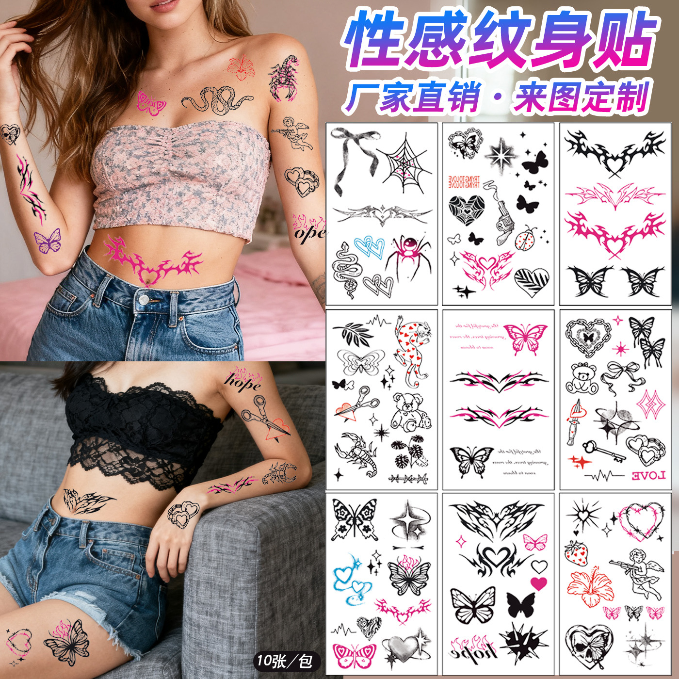 亚马逊新款Y2K风黑色纹身贴朋克风格粉色心形蝴蝶结临时纹身贴纸