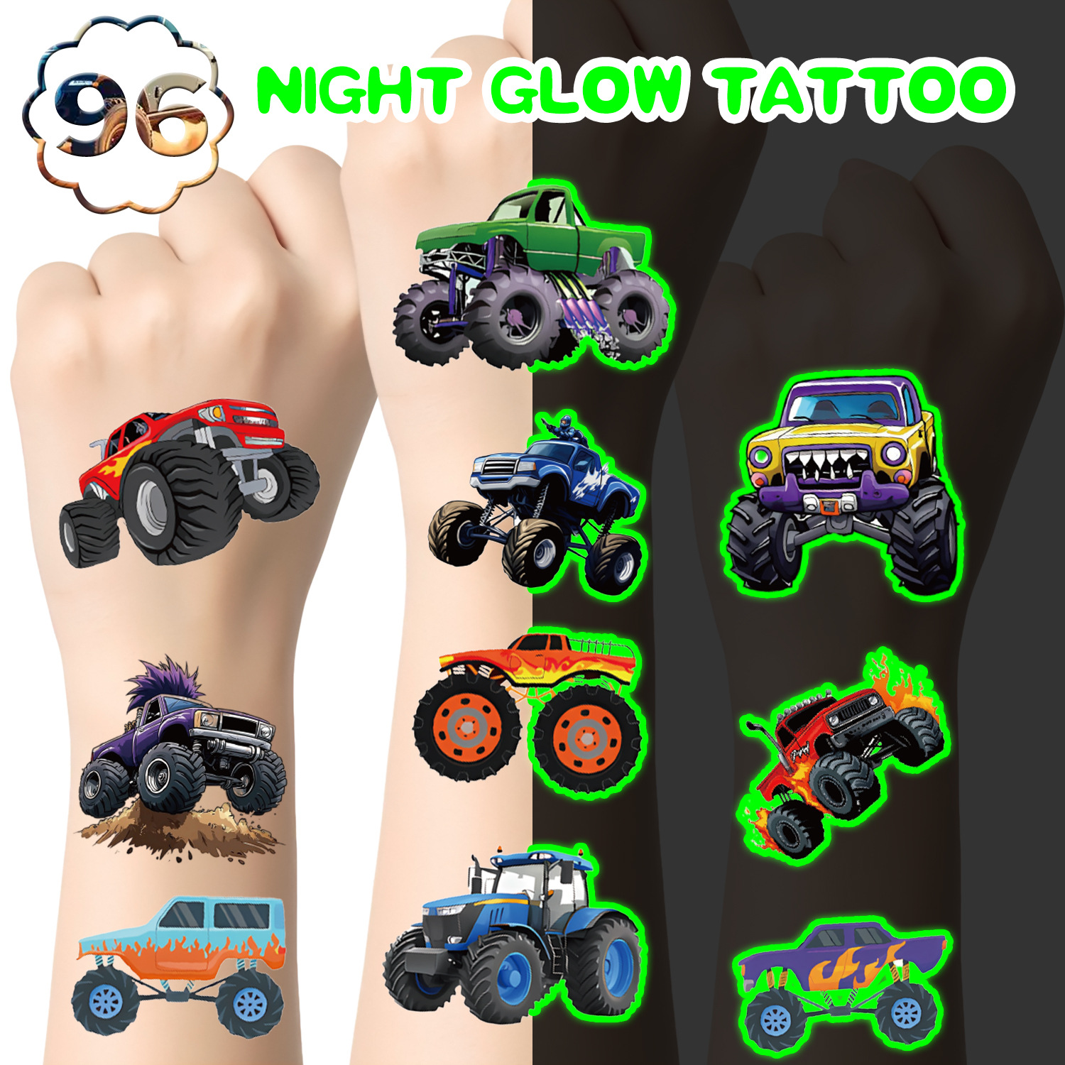 亚马逊96张縁色夜光大脚车纹身贴汽车卡通山地车脸贴高级感贴纸
