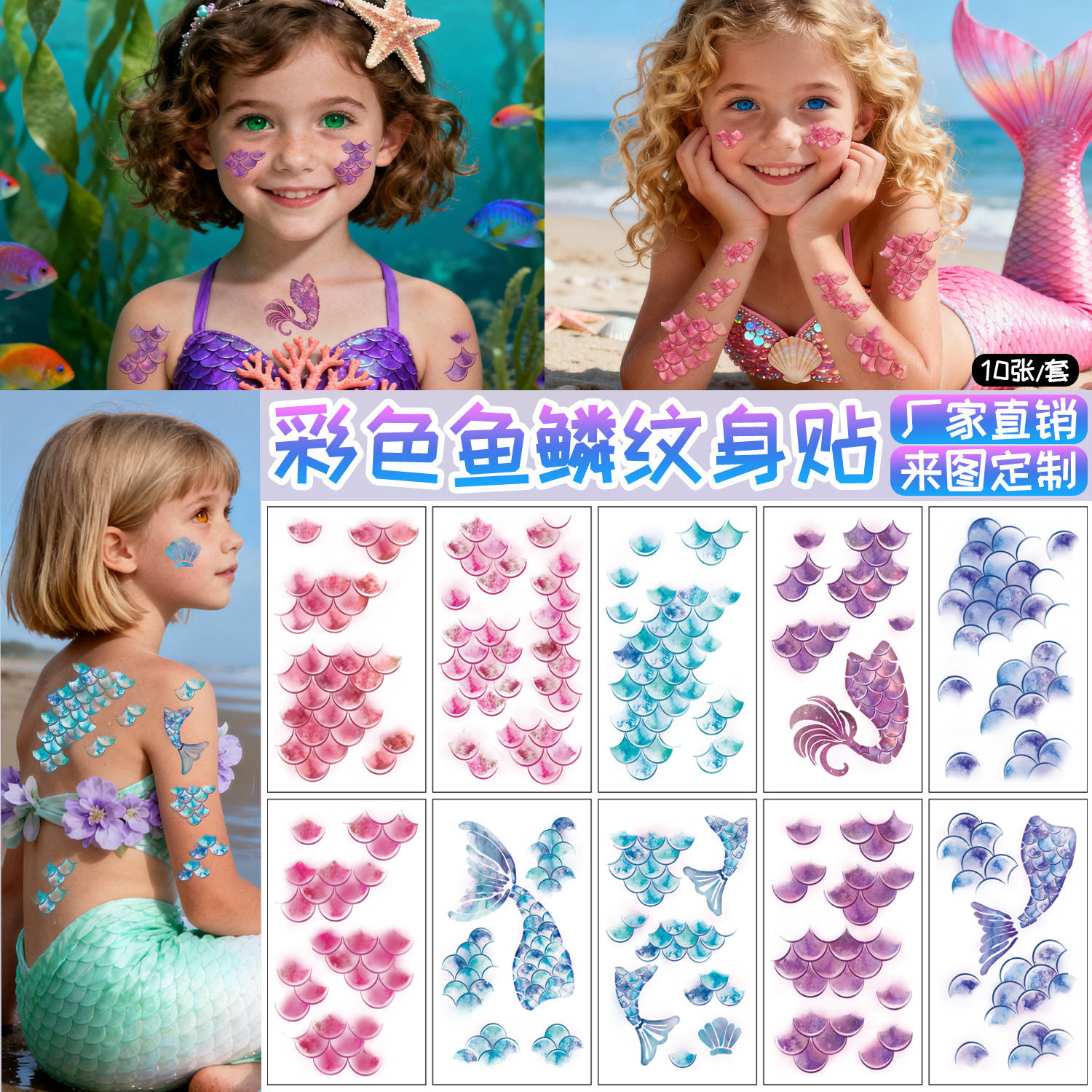 跨境新款彩色鱼鳞纹身贴紫色片片鱼鳞美人鱼卡通高级感纹身贴纸