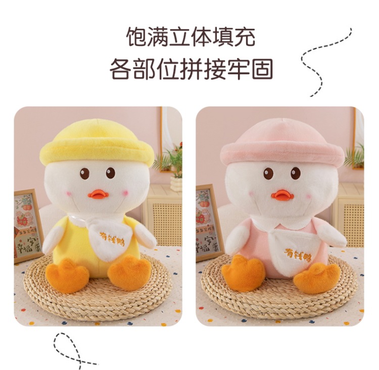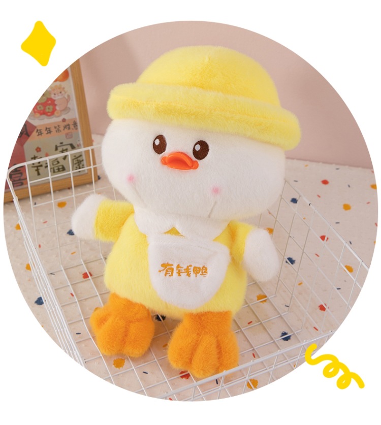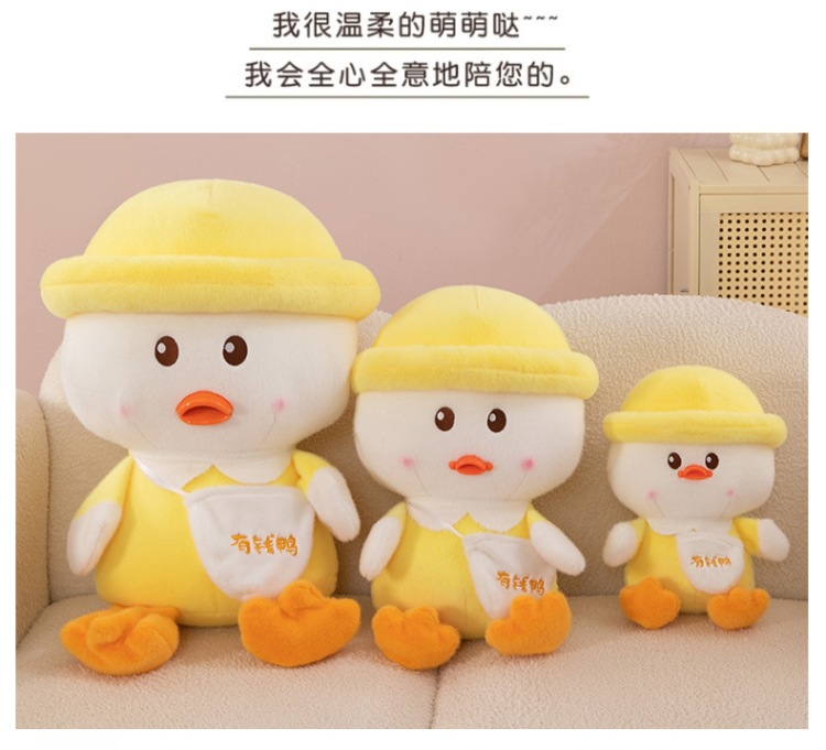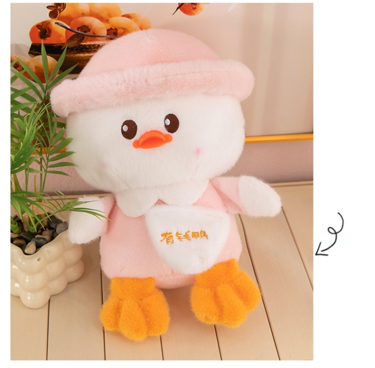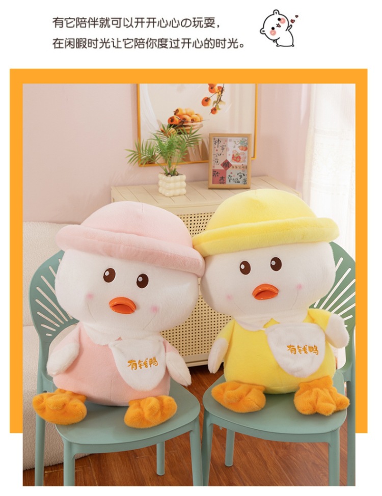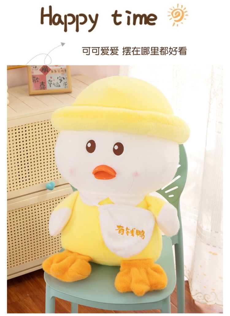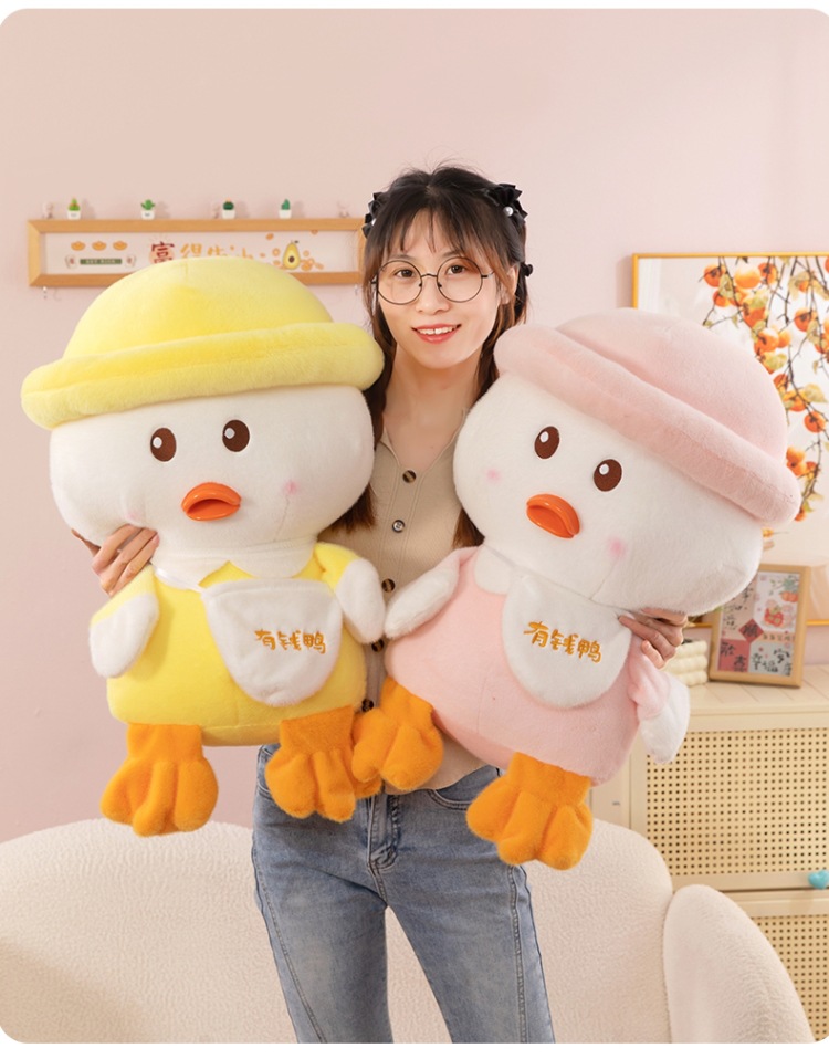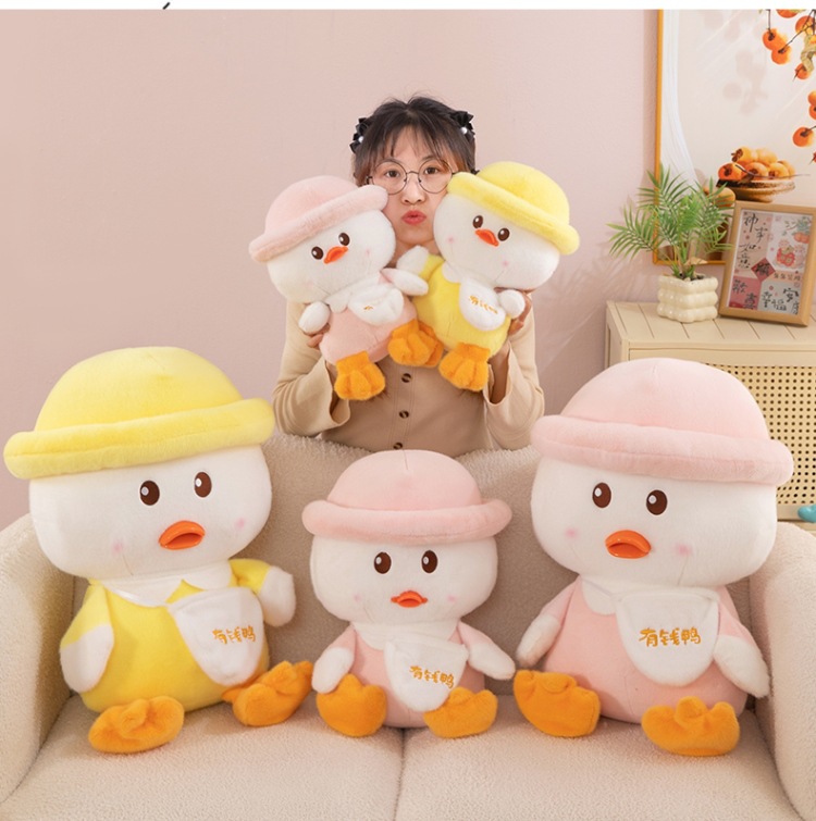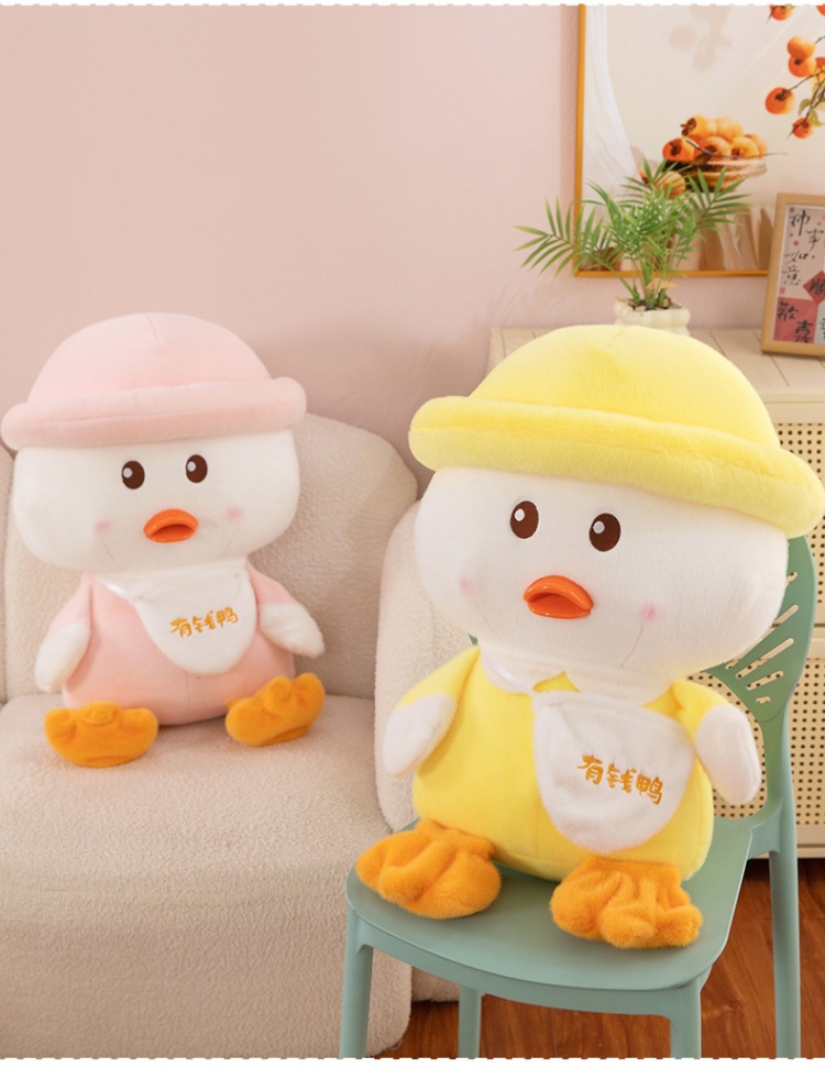 かわいい金持ちアヒルのぬいぐるみ子供が寝ている枕を抱えて帽子をかぶっているアヒルの家に誕生日プレゼントを飾る