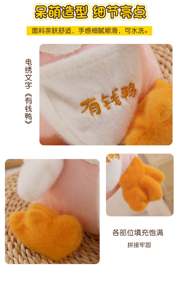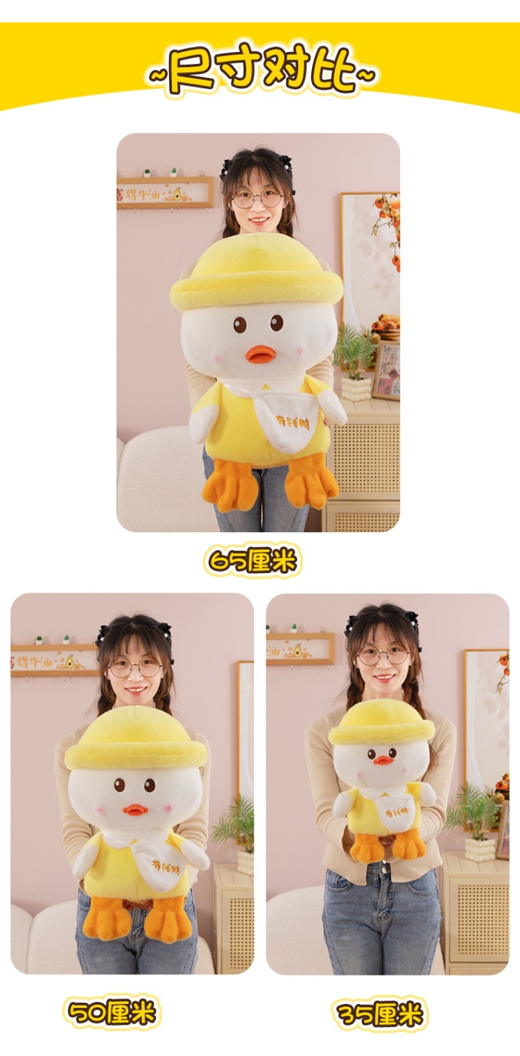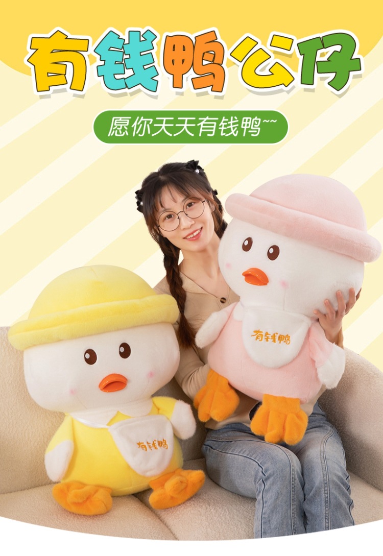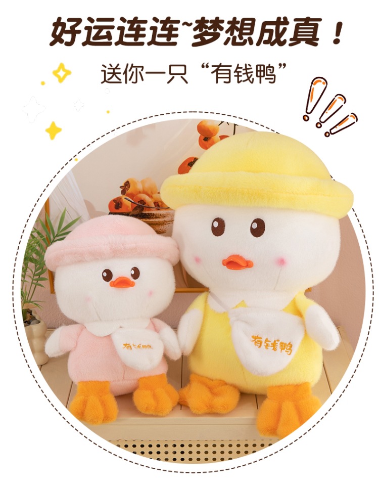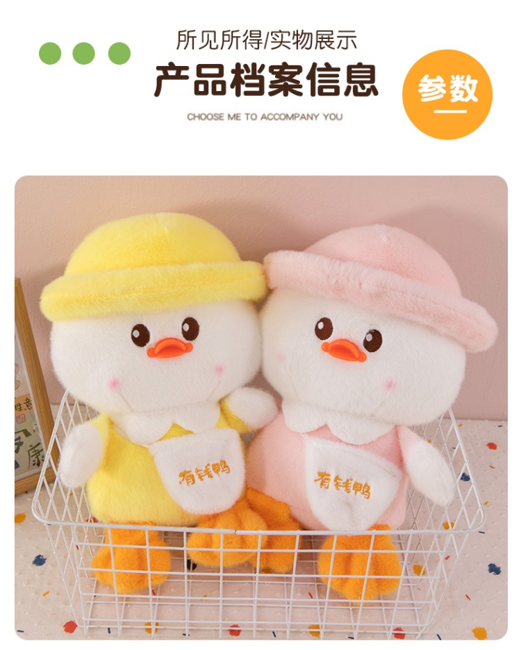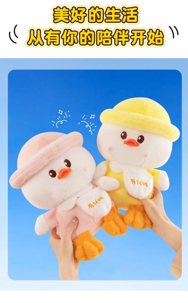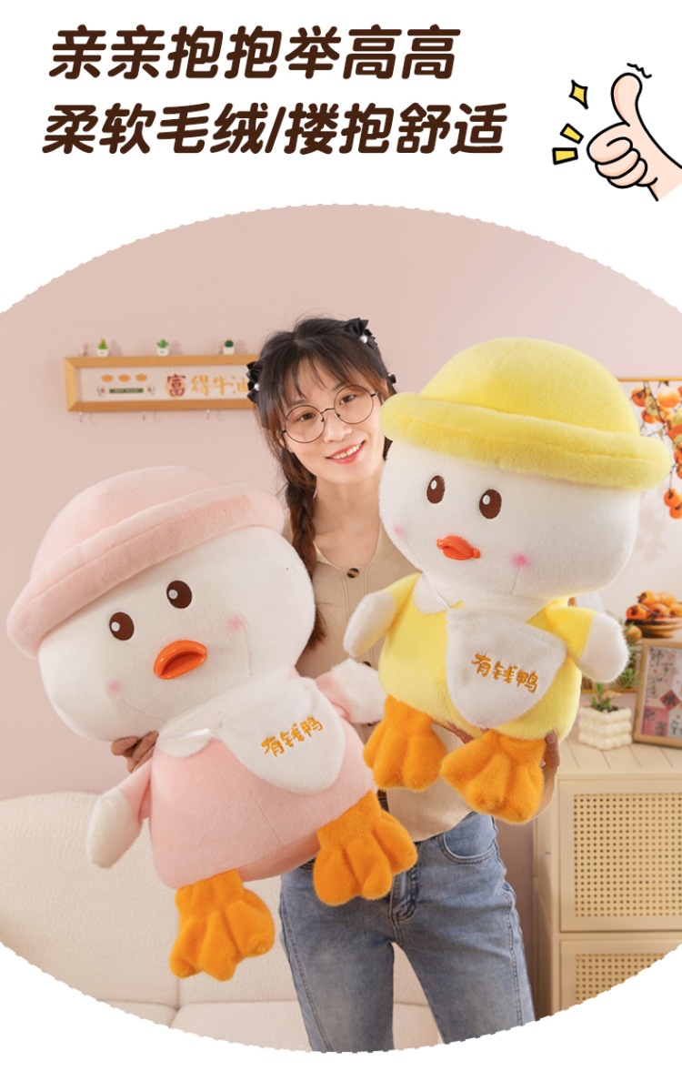 かわいい金持ちアヒルのぬいぐるみ子供が寝ている枕を抱えて帽子をかぶっているアヒルの家に誕生日プレゼントを飾る