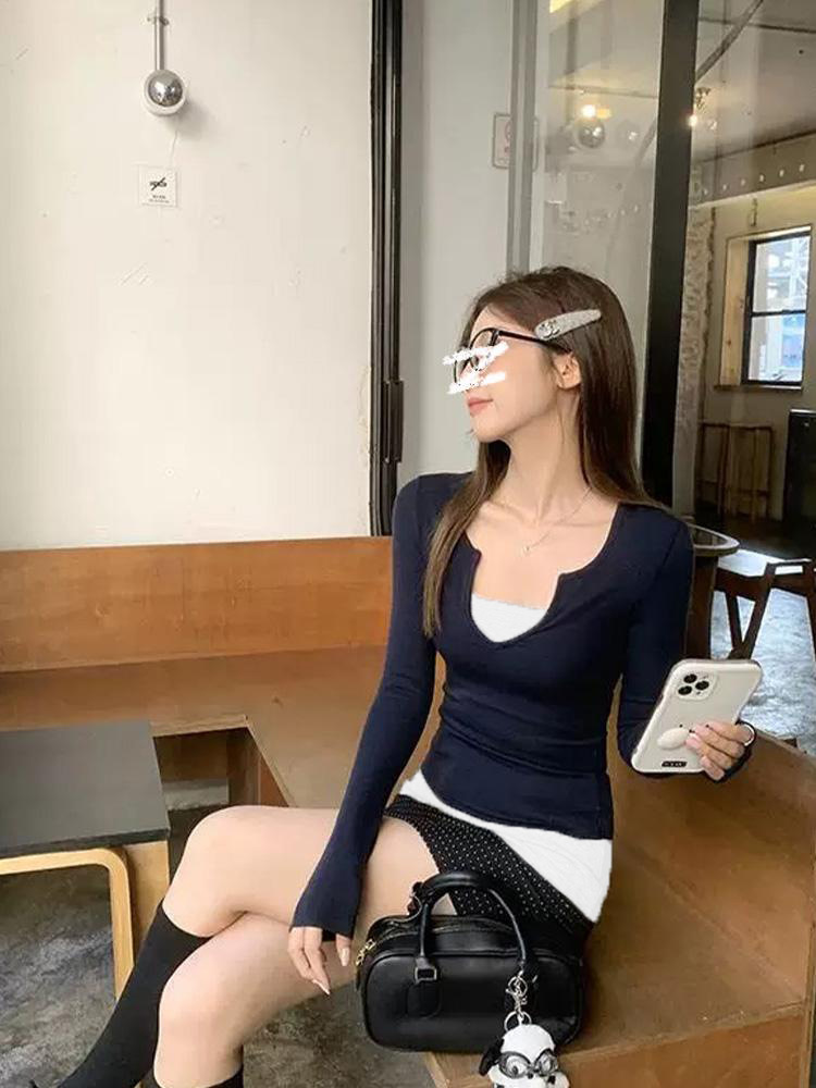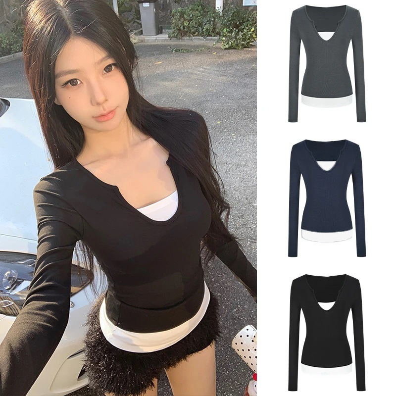 現物スキムズアメリカ風ギャル秀気vネック正肩長袖tシャツモーデール肌に優しい質感のガードル