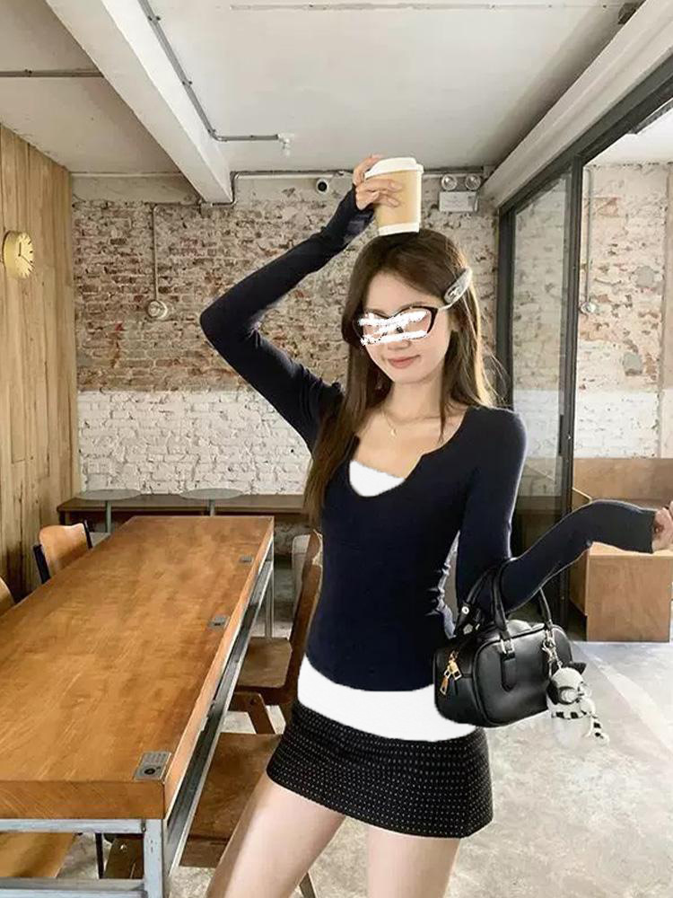 アメリカンレトロなフェイクツーピース長袖Tシャツ、コントラストカラーのホットガールトップス、デザインセンスのある夏用右肩スリムフィットボトムス