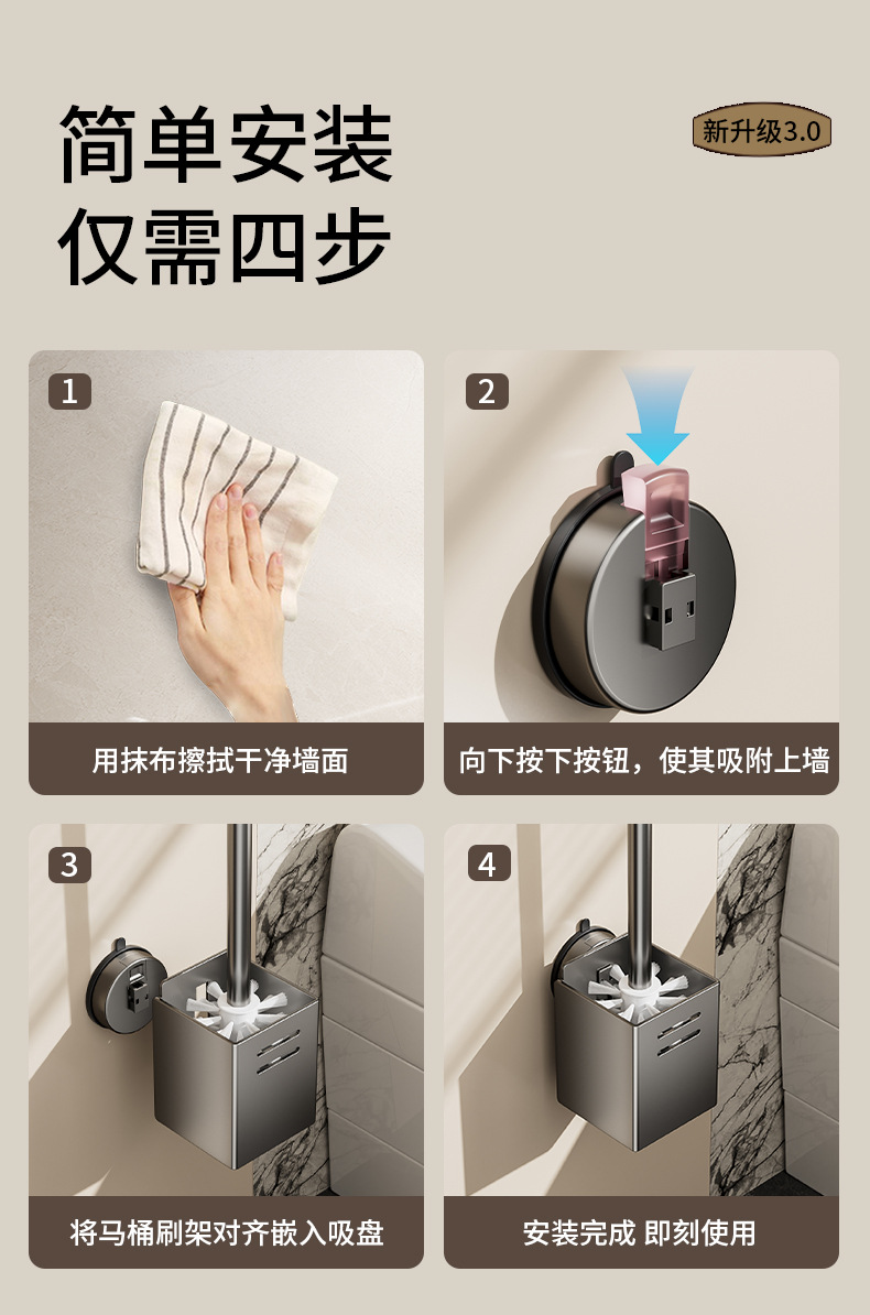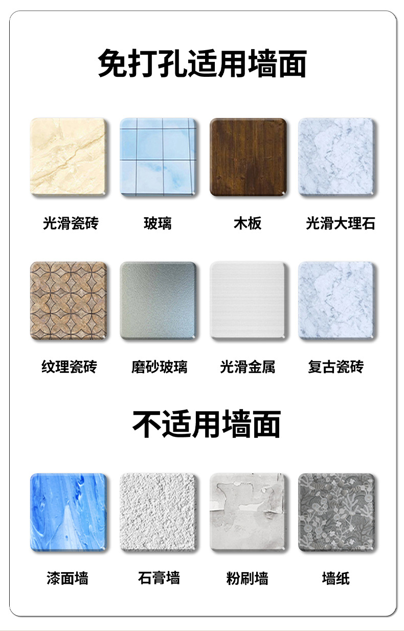 (2)安装请注意,墙面需平整坚固的玻璃瓷砖等。不可用在粉刷墙,墙纸,石灰墙等不平整不坚固的墙面上。