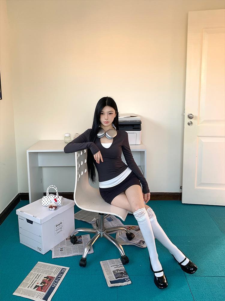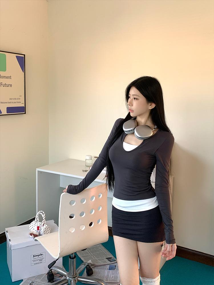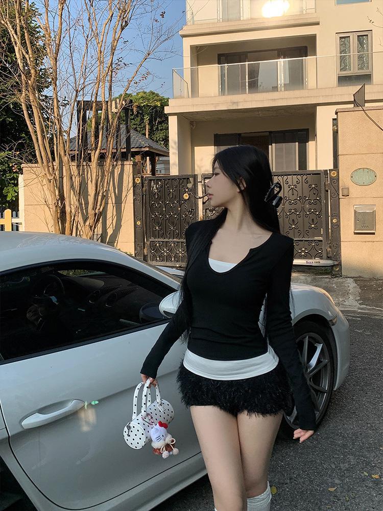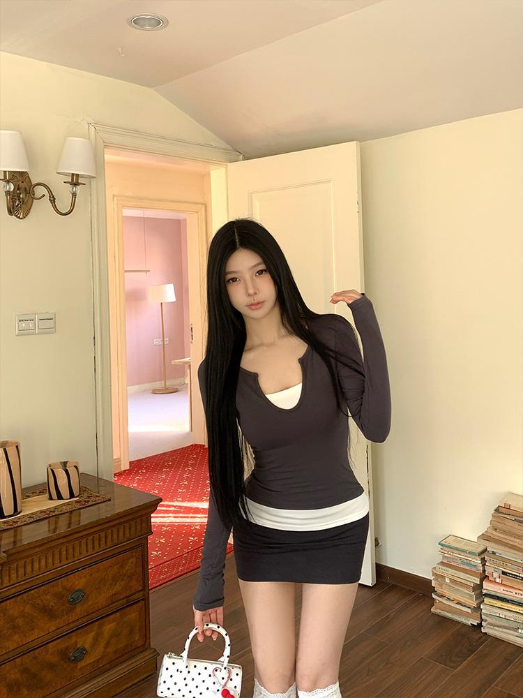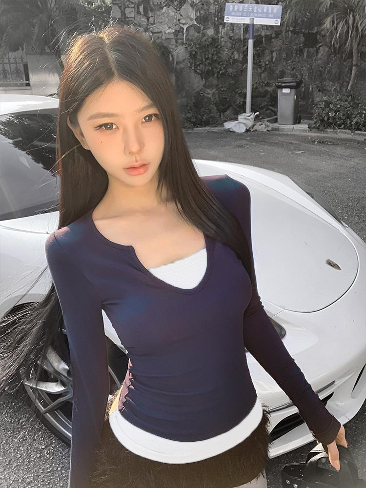 H403V领美式复古拼接撞色假两件长袖女修身显瘦设计感辣妹上衣女
