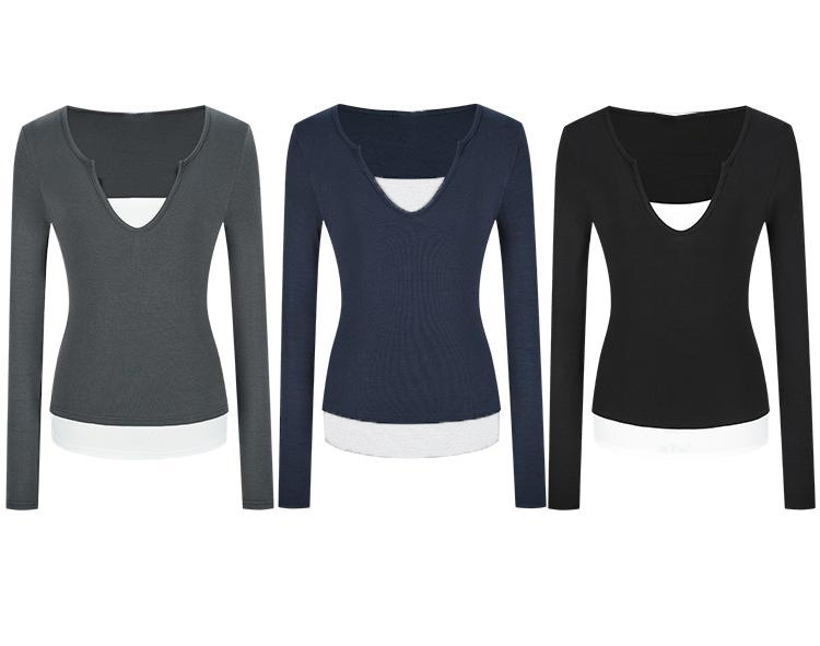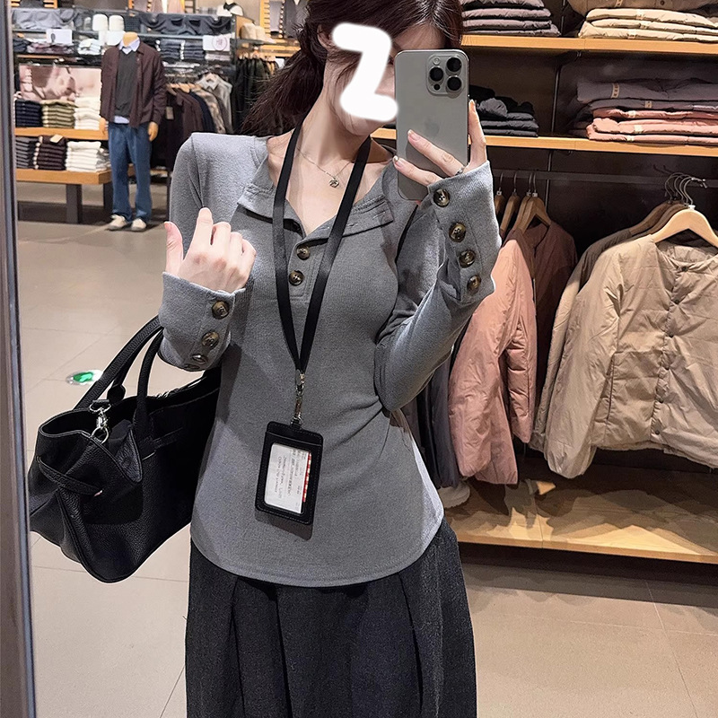 辣妹设计感V领纽扣正肩长袖T恤女加绒加厚秋季内搭打底衫显瘦上衣