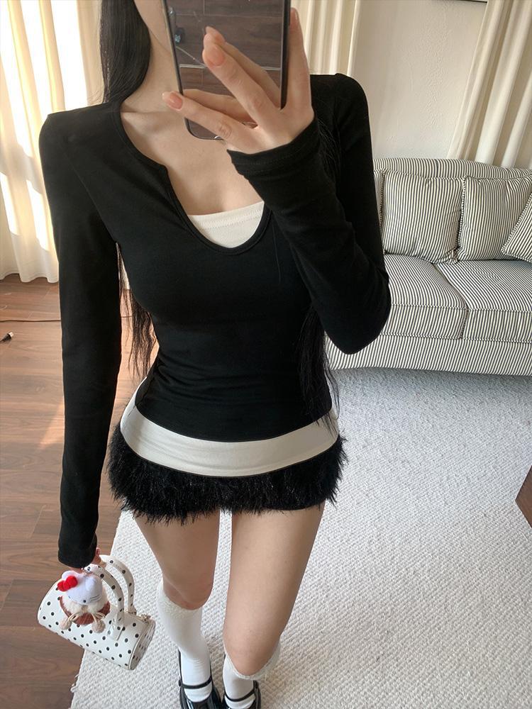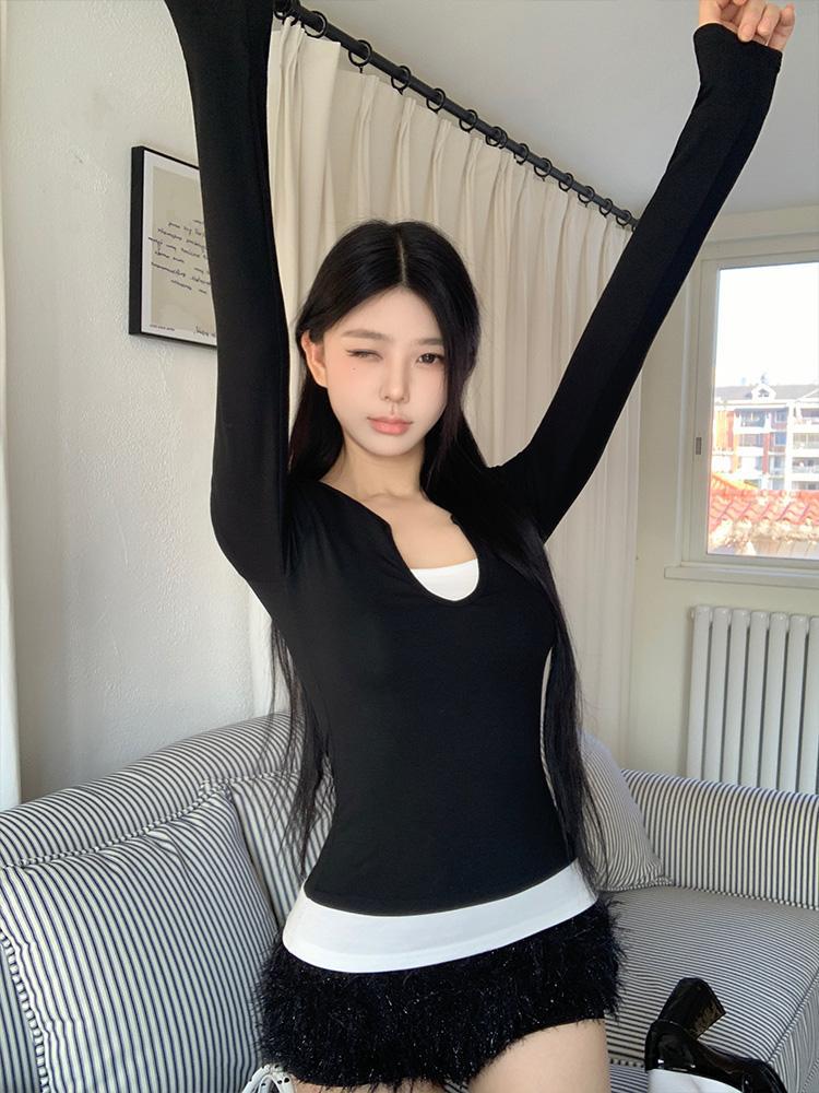アメリカンレトロなフェイクツーピース長袖Tシャツ、コントラストカラーのホットガールトップス、デザインセンスのある夏用右肩スリムフィットボトムス