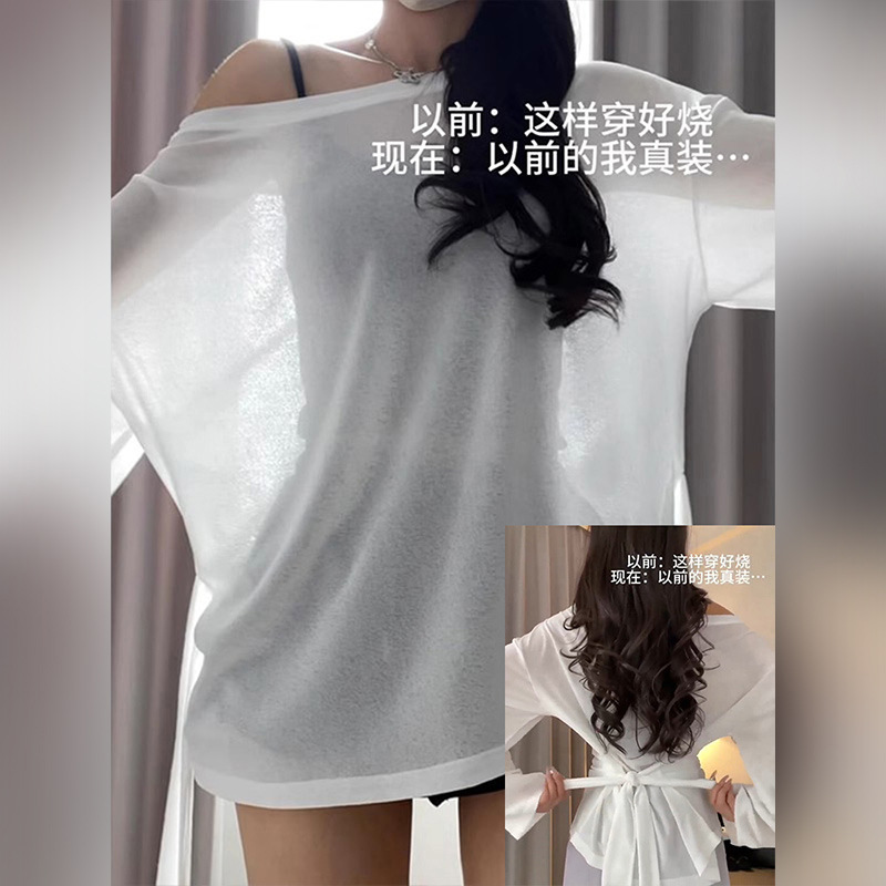 ホワイト日焼け止めブラウス、ウエストを絞る、ゆったりとした薄い2025新しいブラウスデザイン、ウエストを絞るメッシュトップ